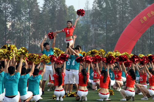 入场式后,举行了庄严的升国旗仪式。院体育运动委员会主任、副院长刘小廷热烈致辞,运动员代表和裁判员代表分别进行了宣誓。随后,在《最炫民族风》的旋律中,工商管理系同学们进行了韵律十足的广场舞表演,艺术设计与建筑工程系同学们在《红日》的歌声中,表演了活力四射的花球啦啦操。两个系的同学们以刻苦的训练和优良的团队精神,充分展示了体育运动的力与美,引得在场观众阵阵喝彩和赞叹。