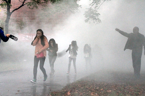 下午3时许,随着消防演练现场总指挥、治安保卫处处长魏兆春下令“消防逃生疏散演练开始!”,顷刻间,图书馆一、二层内外浓烟弥漫,火警警报骤起,图书馆工作人员立即起身向室内正在阅读书刊的学生们报警:“一楼发生火情,请大家向楼层两侧安全出口迅速撤离!”。随即同学们在治安保卫处、图书馆工作人员和保安队员的引导下,迅速从安全出口依次撤离,仅两分多钟时间图书馆所有学生撤离完毕,疏散到空旷地带,演习达到了预定目的。不少刚刚冲出“火场”的学生表示,虽然心里知道刚刚发生的一切就是一场演习,但是,穿行在浓烟滚滚的图书馆走廊时,还是能体验到那种身临其境的逃生感觉,以后万一真的碰到火灾,也知道如何去做了。
