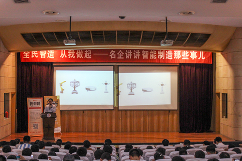 来自南京埃斯顿自动化集团市场部经理卢昊为全场两百多名师生讲解了工业机器人的发展现状及趋势,并对工业机器人的基础产品、集成应用软件与技术、智能制造的应用前景进行了介绍。