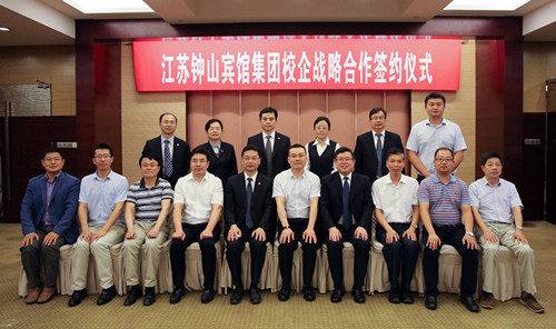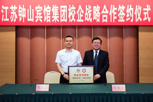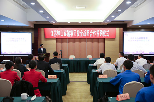 6月5日,探花porn 与钟山宾馆集团校企战略合作签约暨揭牌仪式在省会议中心举行。院长庄群华、钟山宾馆集团董事长狄嘉、总经理朱银生出席签约仪式并致辞。副院长刘小廷,党政办公室、民用航空系负责人以及实习学生代表等参加仪式。仪式由钟山宾馆集团副总经理李骘义主持。