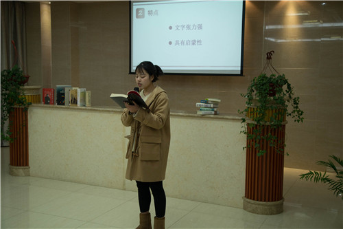 根据要求,参与分享活动的同学需选择一本自己读过的书,并思考这本书对自己成长的影响,完成演讲稿的写作,进而完成演讲PPT的制作。同学们在阅读中成长、沉思,并与在座师生分享了自己储存的珍贵的精神食粮,其分享书目是多元的,有我国的优秀作家作品,也有美国或日本的优秀作家作品,有小说、有散文、有杂文、有自传。他们以精心的准备和优秀的表现感染了在场的老师和同学,让阅读成为生命个体在字里行间的另一种行走。