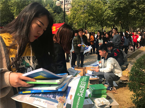 开学前一天,在辅导员的带领下,同学们都领到了新书。发书现场井然有序。