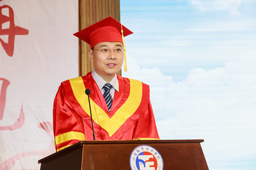 院长庄群华发表了以“做新时代的奋斗者”为主题的讲话,他首先代表学校向全体2018届毕业生圆满完成学业表示热烈的祝贺,他指出,三年来,同学们在学习和生活中创新实践,用实际行动践行了“敏于行,勤于思”的学风,践行了“孝宽诚责毅”的五字文化。作为师长,为同学们所取得的进步与成绩感到骄傲,对同学们为学校的发展所付出的努力与汗水表示感谢。同时,他还对毕业生提出三点希望与嘱托,第一,希望同学们不忘初心,做坚忍不拔的追梦人。要坚定追逐梦想的自信和决心,坚守最基本的价值观,永远保持独立思考,客观地面对现实,理性地对待梦想,在仰望星空的同时,更要脚踏实地,从点滴做起,一步一个脚印,把长远的梦想与短期的目标结合起来,不忘初心,砥砺前行。第二,希望同学们秉承匠心,做本领过硬的能干人。要有追求卓越的态度和止于至善的技艺。任何工作都有一定的规律和遵循,必须保持进取,不断超越,才能有所成就。希望同学们在今后的工作学习中,用工匠精神要求自己、打磨自己,锻造出过硬本领,最终成为某个领域的行家里手。第三,希望同学们永葆好奇心,做创新创业的开拓者。在脚踏实地追寻梦想时,一定要有探索未知的好奇心,要有创新实践的勇气。希望大家在未来的日子里,树立终身学习观念,把握新事物发展脉搏,永远保持不断求索的兴趣,在创新创业的实践中,成就美好未来。