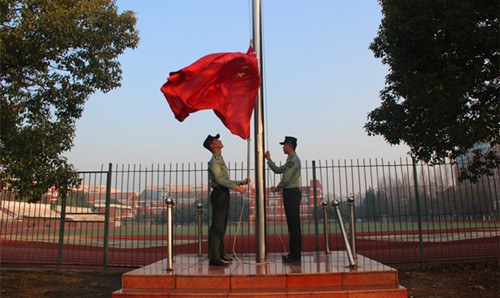 伴着朝阳,全体师生以饱满的热情迎接新学年的第一次升旗仪式。