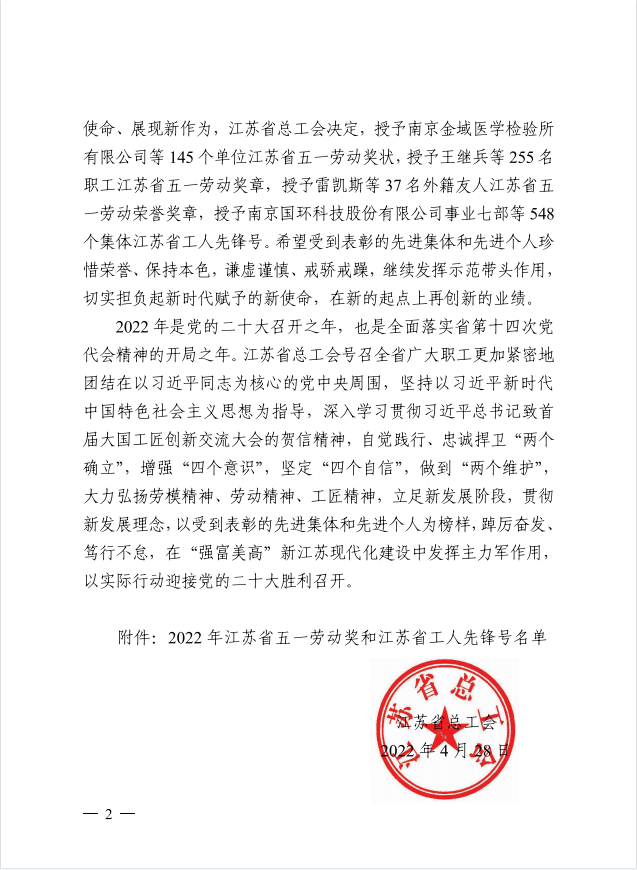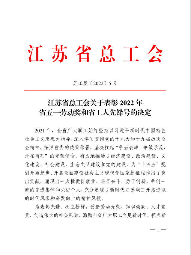 4月28日,江苏省总工会发布了《关于表彰2022年省五一劳动奖和省工人先锋号的决定》(苏工发[2022]5号),探花porn 被授予省五一劳动奖状。