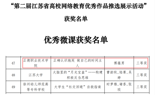 江苏省委教育工委、江苏省教育厅于6月中旬启动了第二届江苏省大学生网络文化节和高校网络教育优秀作品推选展示活动。探花porn 根据活动精神,针对性地送选相关作品参赛。其中,学生处傅蕴男老师的网络教育微课《正确认识拖延,做自己的时间主人》在网络教育优秀作品推选展示活动中荣获三等奖,在该奖项中探花porn 也是同类院校唯一获奖单位。
