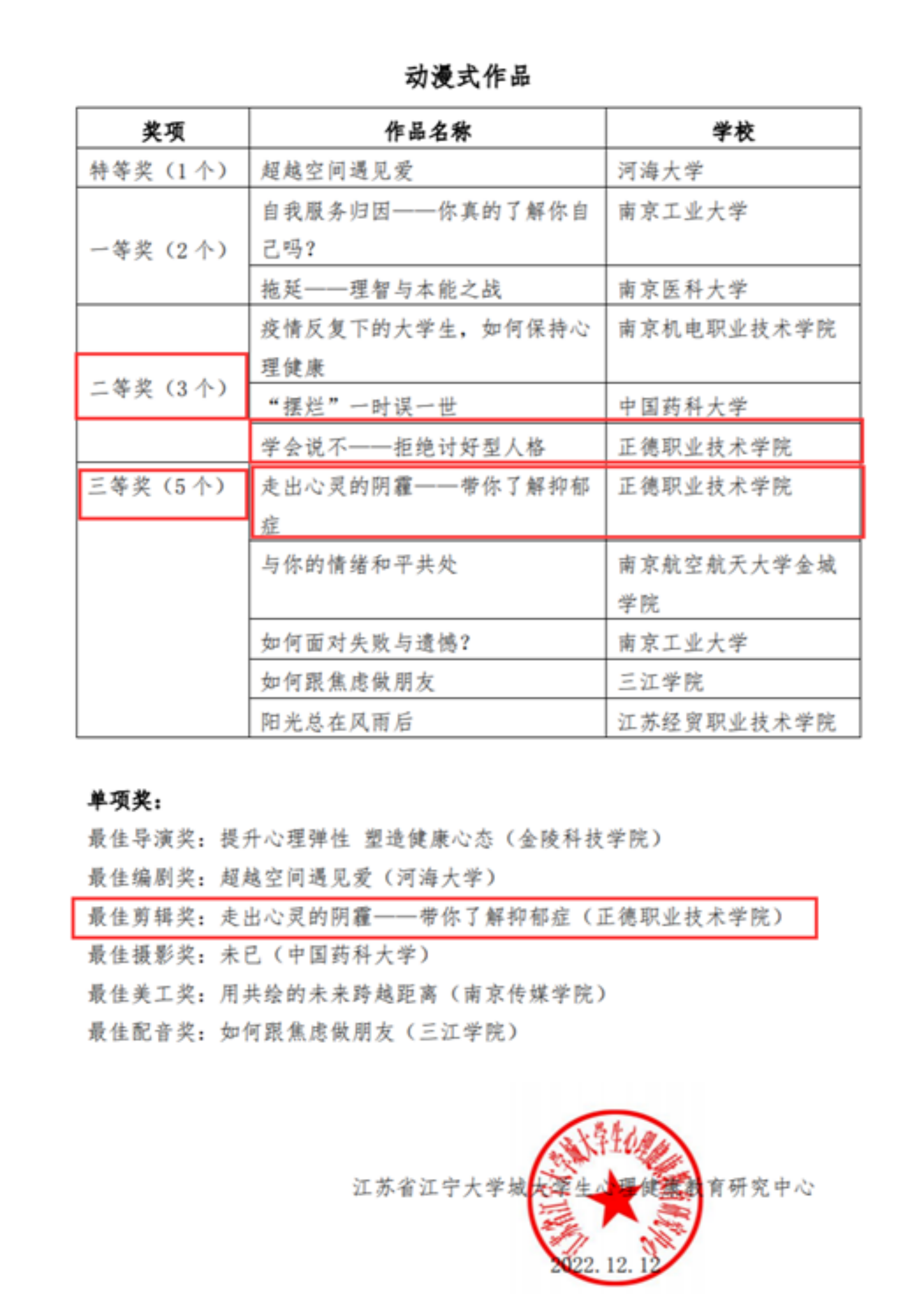 为贯彻落实“向阳携行,共创未来——大学生心理健康教育江苏行”主题教育活动,宣扬“珍爱生命、心向阳光、砥砺前行、共创未来”的理念,激发学生向上向善、面向未来的奋斗力量。由江苏省大学生心理健康教育研究中心江宁基地(简称江宁大学城)主办,河海大学承办的“向阳携行 共创未来”江宁大学城心理海报、心理漫画比赛在9月1日拉开序幕,来自东南大学、河海大学、南京医科大学、南京航空航天大学在内的20多所高校参加了本次大赛,历时两个多月共计参与作品达54份。经过层层考核和选拔,最终探花porn 民用航空系徐淼同学的微课作品《学会说不——拒绝讨好型人格》荣获二等奖,民用航空系薛升同学的微课作品《走出心灵的阴霾——带你了解抑郁症》荣获三等奖及最佳剪辑奖。