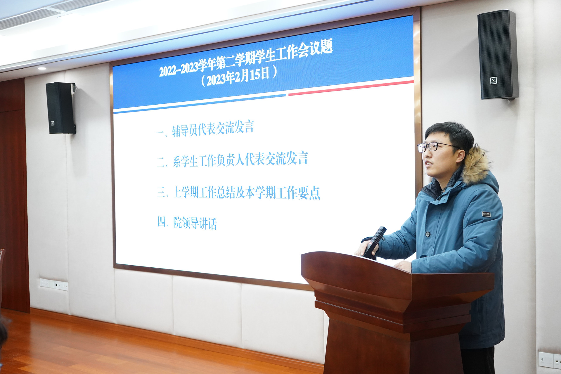 祝佳俊从思想政治教育、学风建设、心理健康教育、就业创业工作、学工队伍建设五个方面回顾了上学期学生工作的开展情况以及不足和改进方向,并对2023年春季学期学生教育管理工作进行重点部署。