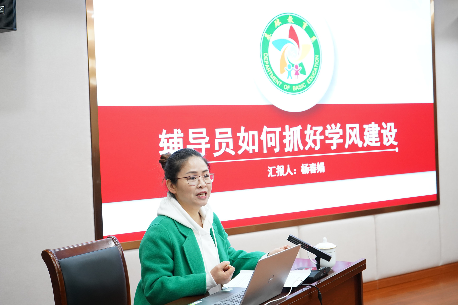 随后,基础教育系杨春娟副主任,以“如何抓好学风建设”为题,分别从学风建设的内涵及意义、学风的构成要素、当前学生学风中存在的问题、学风建设的主要举措等四个方面阐述了本系在2022年学风建设中的良好做法和积极思考。