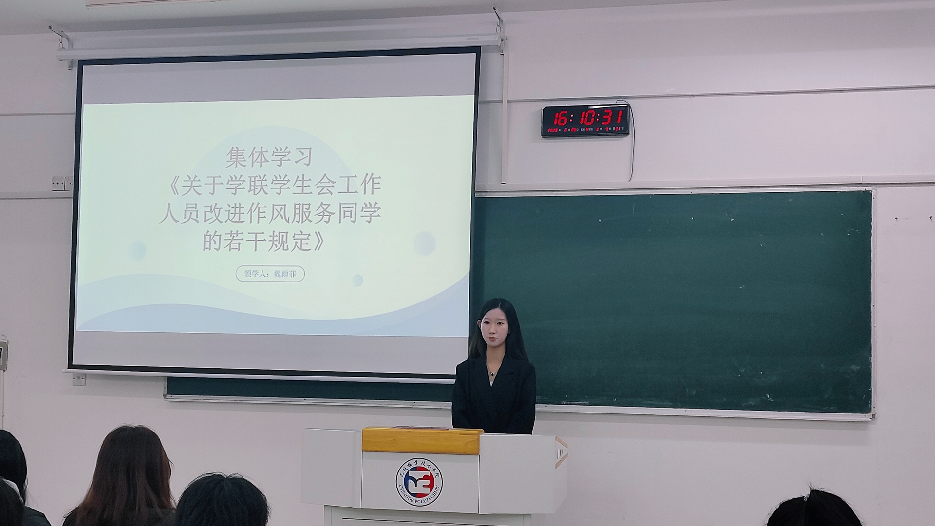 魏雨菲领学《关于学联学生会工作人员改进作风服务同学的若干规定》,通过讲解强化服务职能、培育清新组织文化等方面,深刻诠释了学生会改革的重大意义与改革的必要性。并强调学生会工作的要点,强化学生会组织工作人员的服务意识。