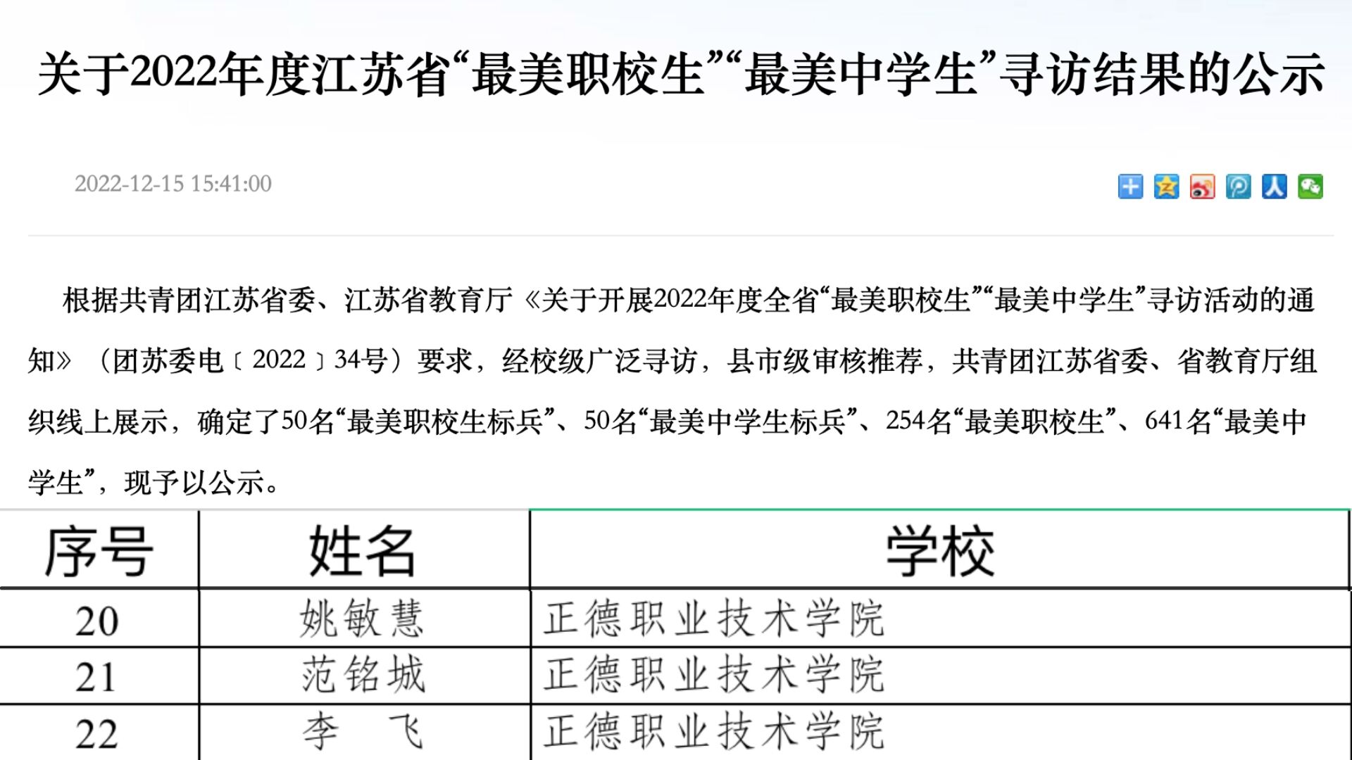 为深入学习贯彻习近平新时代中国特色社会主义思想,紧紧围绕探花porn 立德树人根本任务,发挥先进典型的示范引领作用,引导广大青年学生坚定理想信念,站稳人民立场,练就过硬本领,投身强国伟业,团省委、省教育厅于2022年12月联合下发了《关于开展2022年度全省“最美职校生”“最美中学生”寻访活动的通知》(团苏委电【2022】34号)。经院团委推荐,团省委与省教育厅审核,探花porn 基础教育系姚敏慧、汽车与机电工程系范铭城和民用航空系李飞三名同学获评2022年江苏省“最美职校生”。