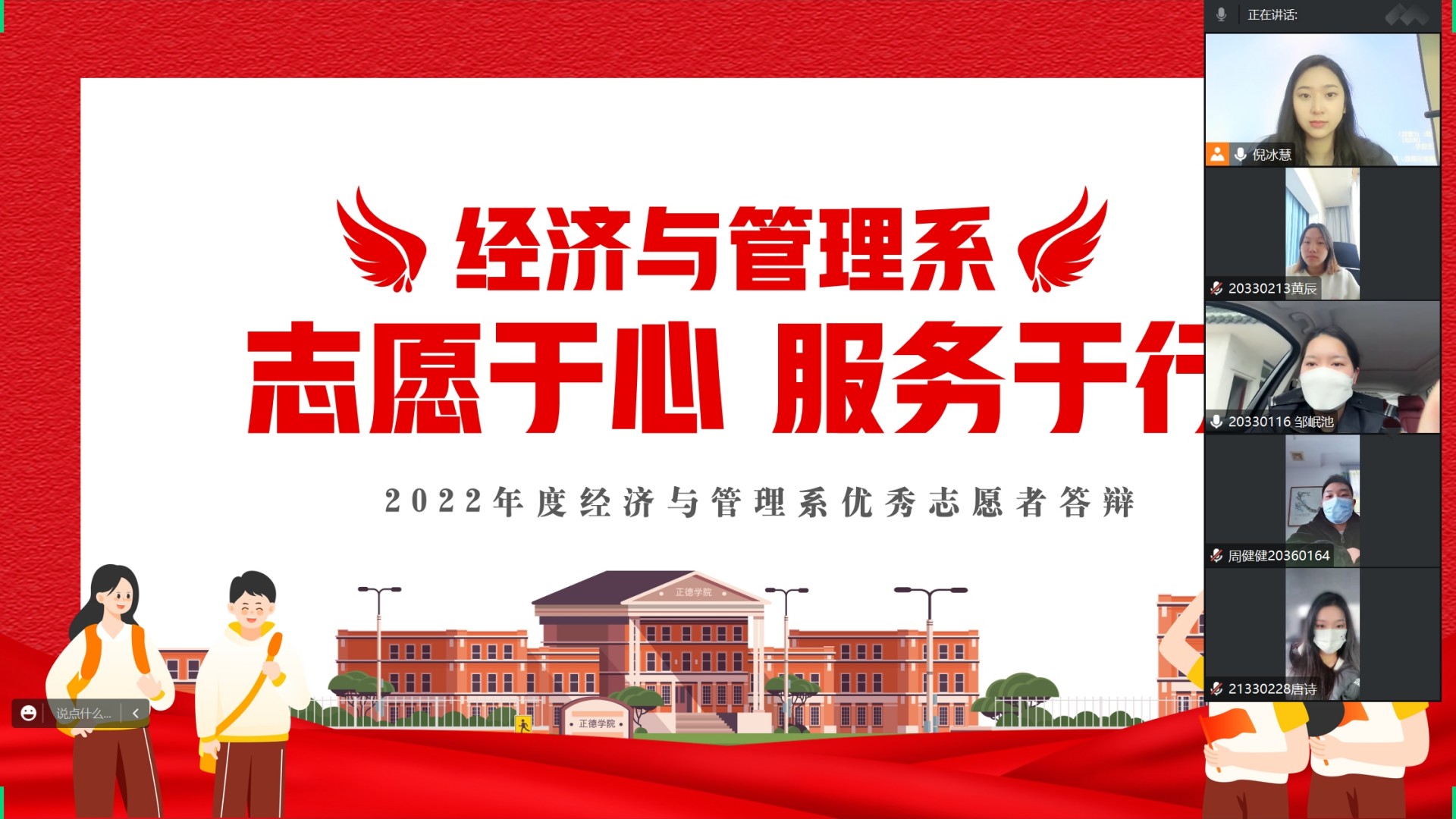 为深入学习贯彻党的二十大精神,深刻把握雷锋精神的时代内涵,经济与管理系开展了“志愿于心,服务于行”2022年优秀志愿者答辩会。鉴于大三学生在外实习的情况,本次答辩会采用线上线下相结合的方式进行。经过个人申报、团支部推优,共遴选出20位青年志愿者参加本次答辩会,经济与管理系团总支书记倪冰慧出席答辩会。
