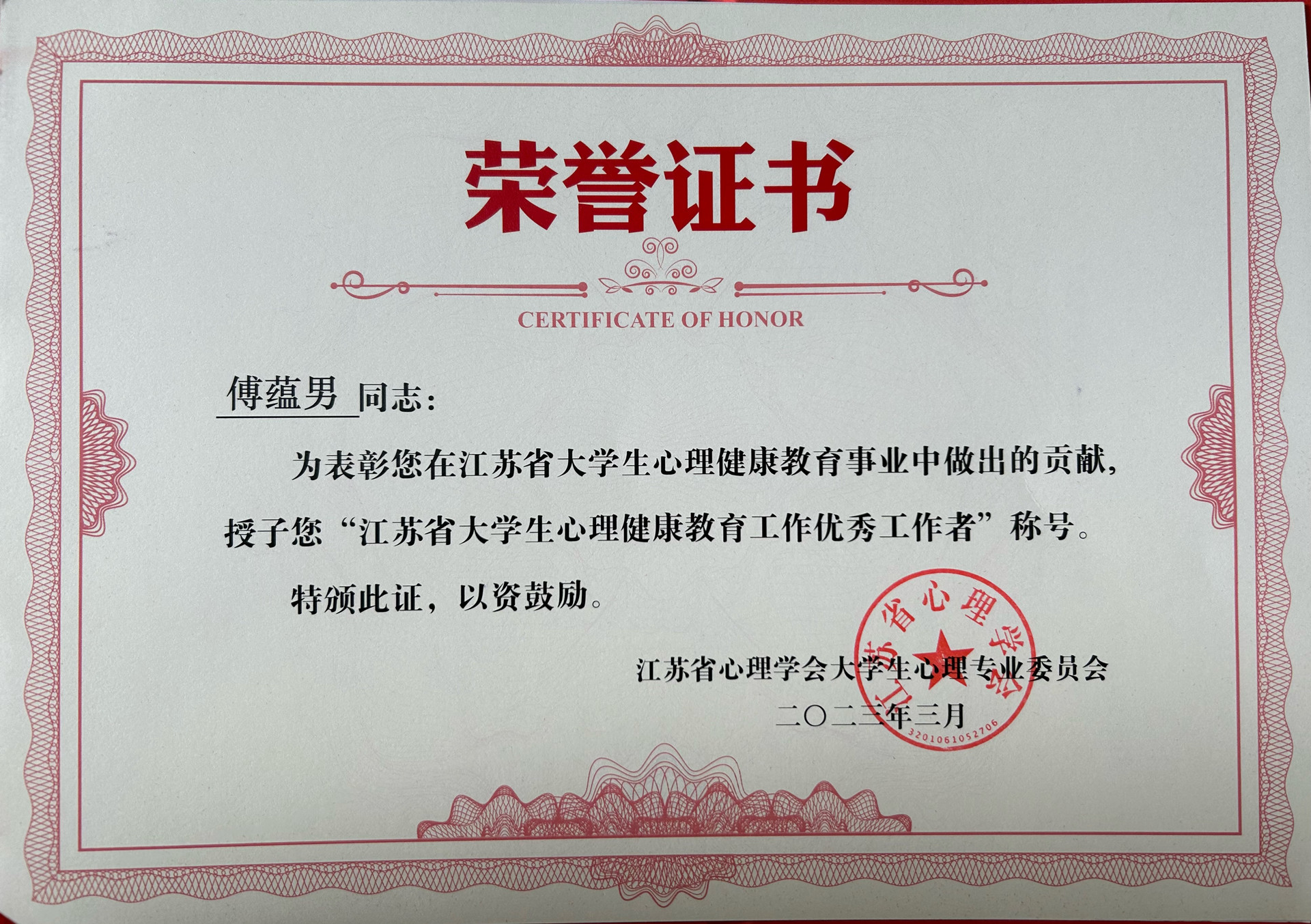3月17日至19日,由江苏省心理学会大学生心理专业委员会主办的江苏省心理学会2022年学术分论坛暨大学生专业委员会年会在常熟理工探花porn 成功举办,来自全省300余名高校心理健康教育工作者参加大会。本次大会对全省高校心理健康教育工作中涌现出的一批勤勉工作、甘于奉献、成绩显著的先进工作者进行了表彰,探花porn 学生处大学生心理健康教育中心的傅蕴男老师荣获“优秀工作者”荣誉称号。