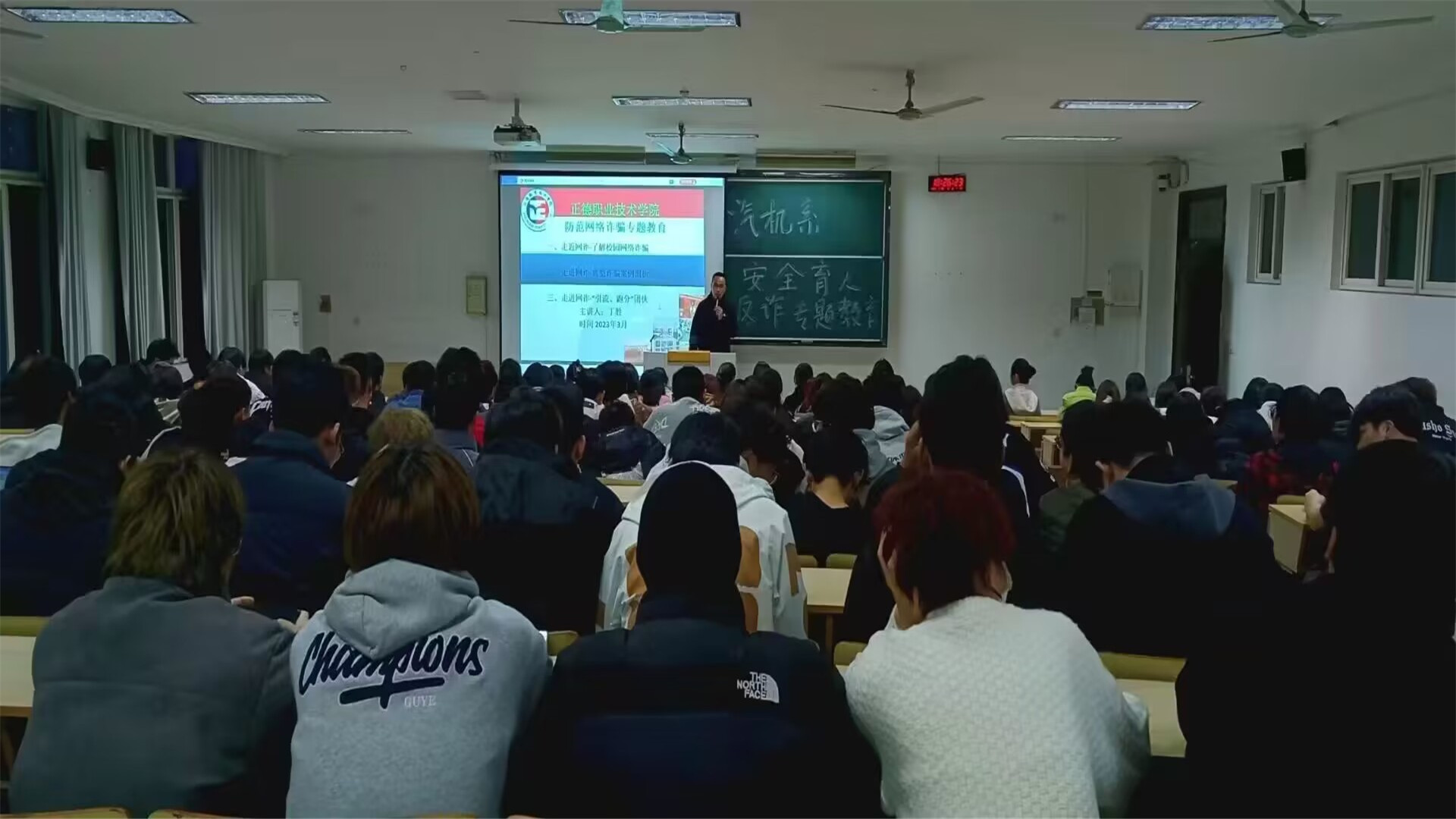 2023年3月22日,保卫处副处长丁胜老师以反诈专题教育为主题,为汽机系近200名学生开展专题防范教育。通过对“身边人”、“身边事”的各类诈骗案件的深入剖析,从诈骗案件的类型、诈骗手段、防范要点进行了互动宣讲,进一步营造了校园反诈氛围,增强了学生的防诈意识。本学期以来,保卫处以反诈骗为内容已陆续对学生开展安全防范教育5场,制作教职工反诈防范宣传手册500份。