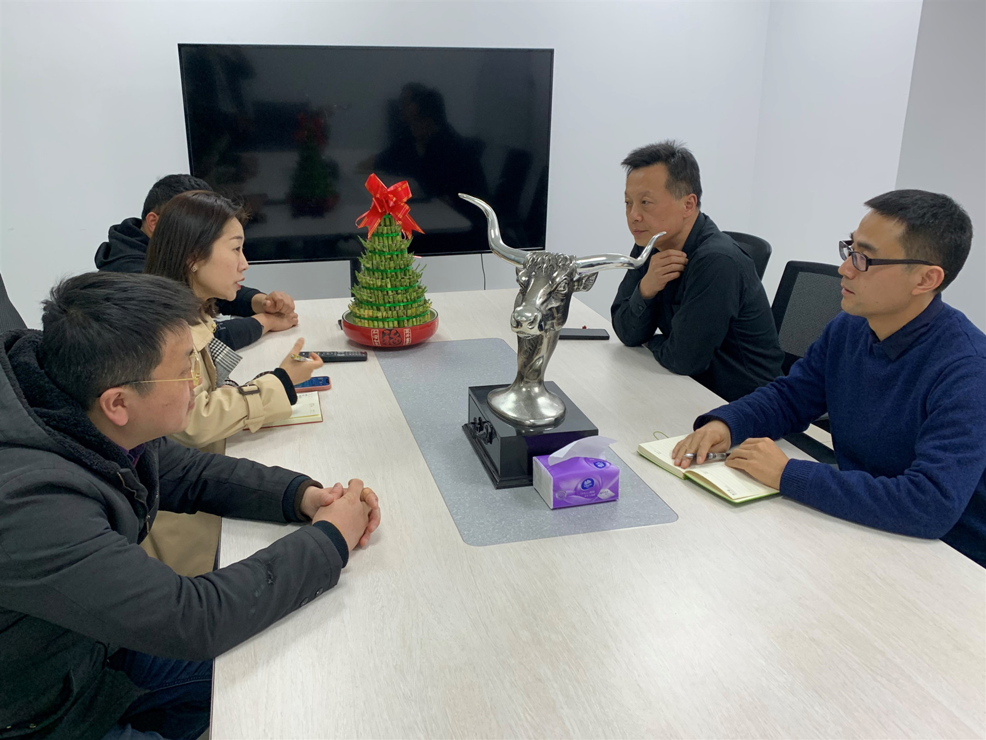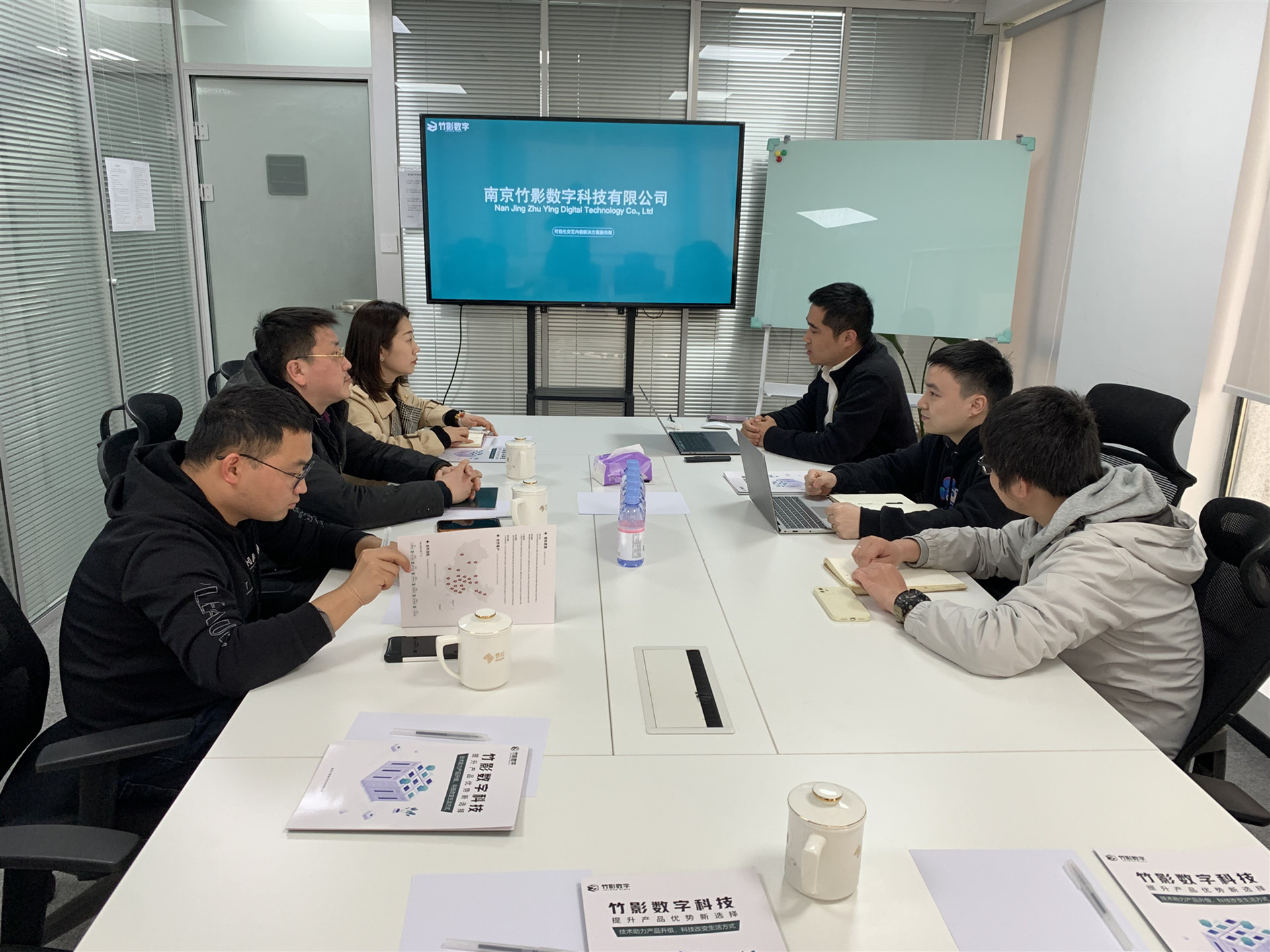 走访完第一家企业后,刘佳率队赶往第二家企业——南京竹影数字科技有限公司 ,该公司总经理范玉峰及人事总监刘世峥热情接待了刘佳一行。