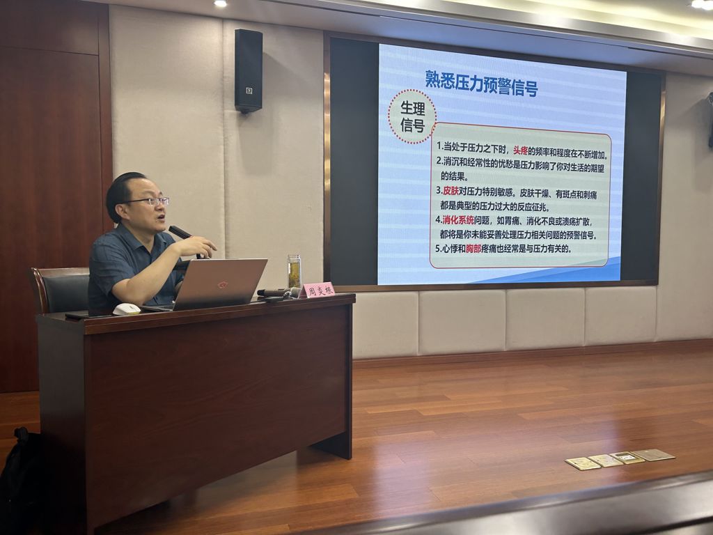 讲座伊始,周教授提出作为大学生健康成长的引路人,辅导员应科学掌握适合自己的方法,用良好的心态正确认识职业压力,及时有效地进行自我心理调节,从而化解职业压力,尽力排除职业倦怠情绪,始终做到以健康良好的心态坚守岗位、投入工作,以激情饱满的状态引导学生、服务育人,在辅导员职业发展的道路上,不断寻找并提高自我价值的归属感、成就感和幸福感。