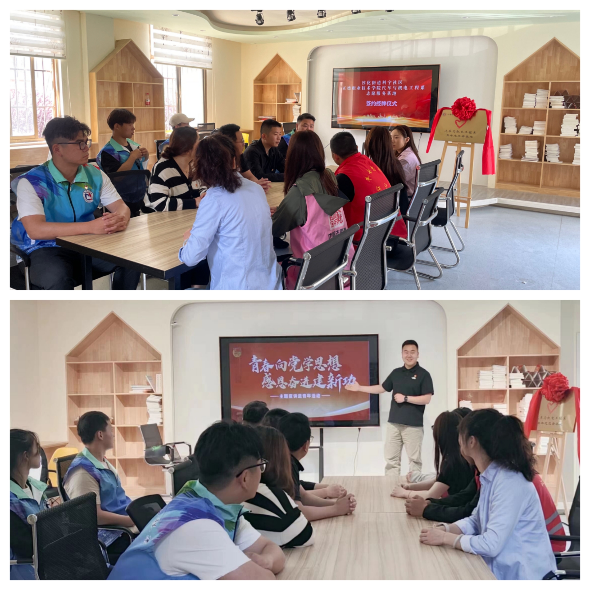 为深入学习贯彻党的二十大精神,推进大学生社区实践计划落实处出实效,进一步聚焦共青团为党育人主责主业,推动本系大学生社会实践活动内涵化、规范化、常态化、长效化发展,5月25日上午,汽车与机电工程系团总支联合淳化街道科宁社区在科宁社区文明实践站举行“青年志愿者基地”授牌仪式。