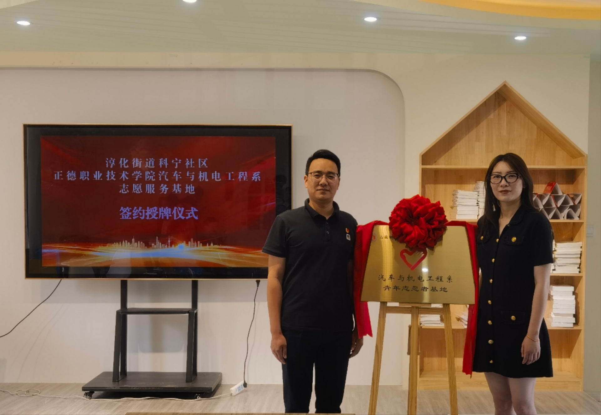 座谈结束,朱翔和贾凯琪共同为“青年志愿者基地”揭牌,随后汽车与机电工程系青年志愿者团队负责人徐嘉乐向社区展示了志愿服务项目计划,并根据汽车与机电工程系专业特点结合志愿者自身与社区工作人员就今后的社区志愿治理活动进行项目深化。