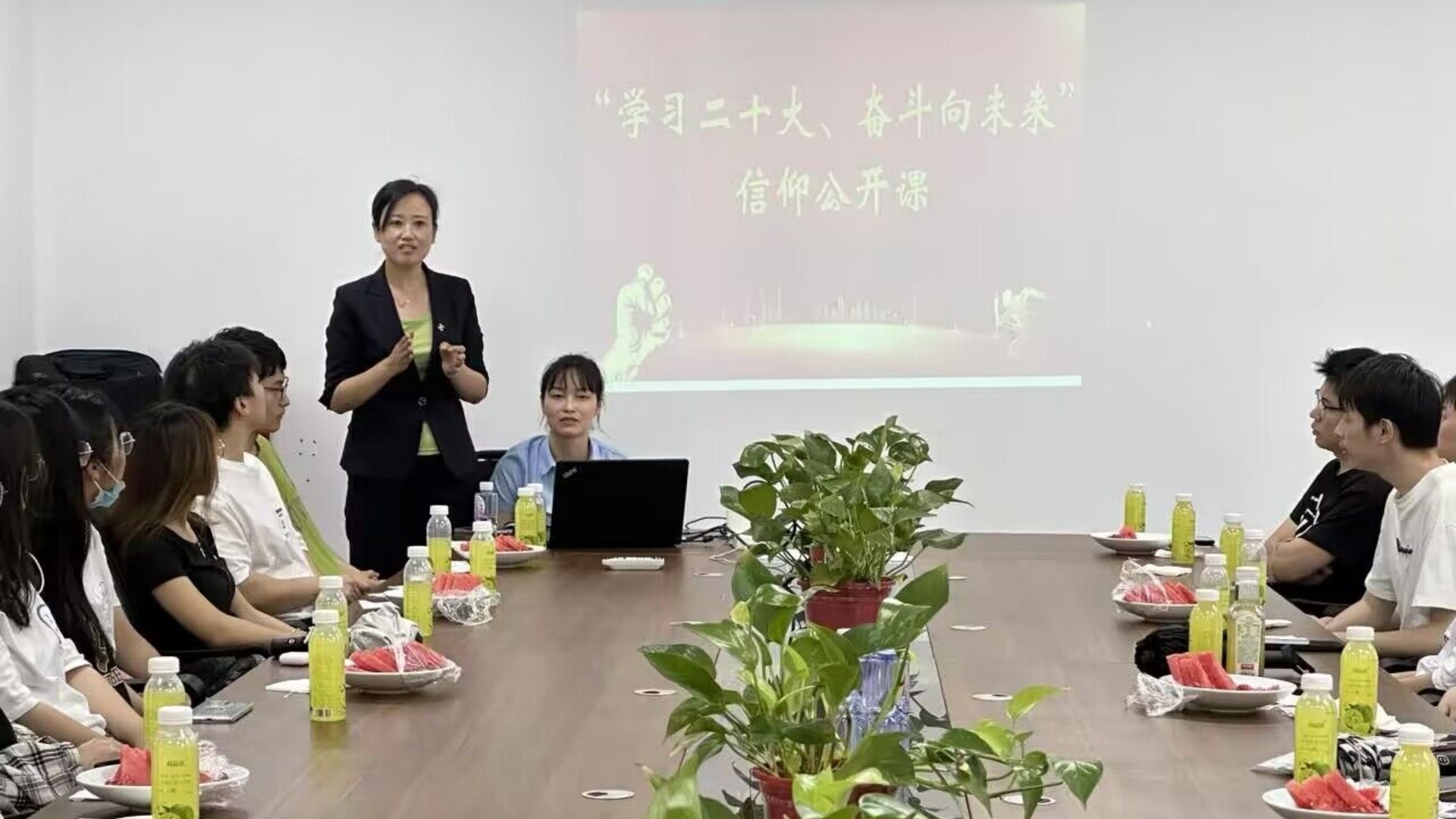 同时,为培养学生职业规划能力和就业意识、帮助学生树立明确目标,蔚蓝集团运营部总监何超为此次同行的30位同学讲授了题为“学习二十大、奋斗向未来”的信仰公开课。何超从“锚定目标、把握机遇、奋斗拼搏、自信自强”四个方面展开。何超向大家分享了个人成长史,勉励大家要在前行中找到自我,在实践中明确目标,在奋斗中获得自信。要珍惜每一次锻炼的机会,在挫折中不断提高技术技能和个人综合素质。他强调,青年要在吃苦中奋斗,在奋斗中成长。青年强,则国家强。当代中国青年生逢其时,施展才干的舞台无比广阔,实现梦想的前景无比光明。新时代的青年要以奋斗为导向,不负时代、不负人民。