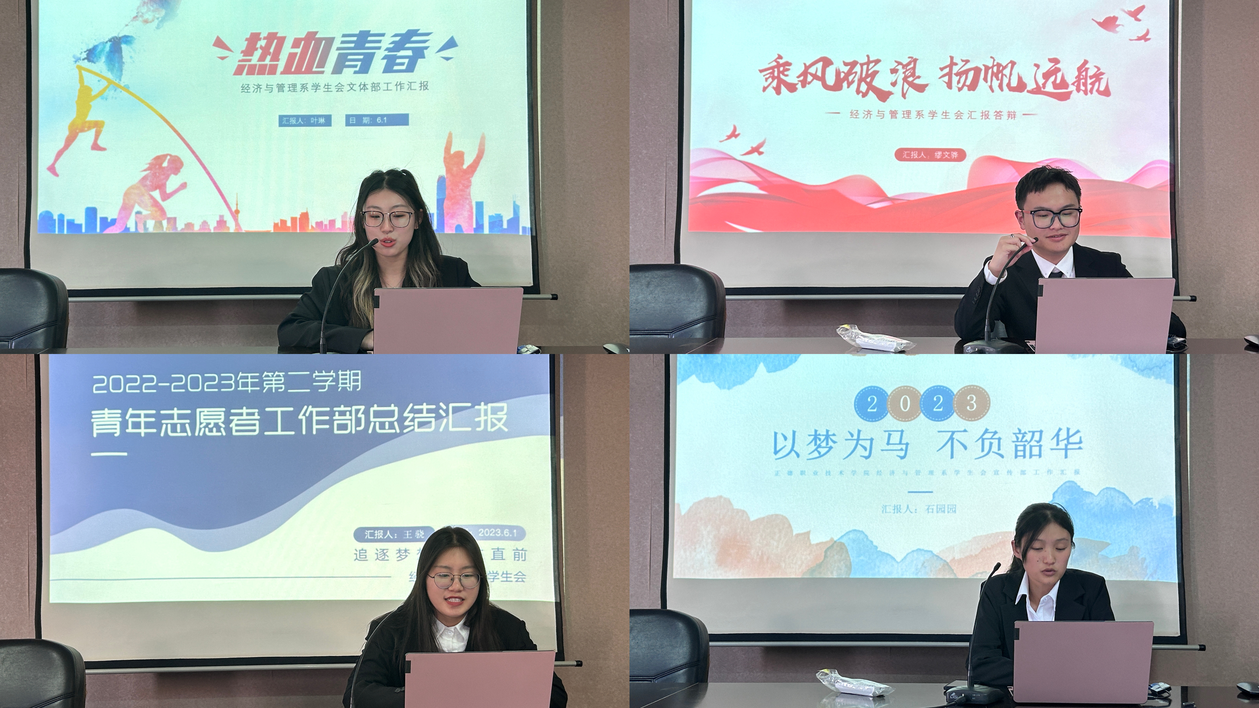 为深入学习贯彻习近平新时代中国特色社会主义思想,进一步落实《探花porn 共青团改革实施方案》和《探花porn 学生会改革实施方案》的相关要求,提高学生干部的责任意识、服务意识和大局意识,深化学生会改革落实述职评议工作,推动团学工作规范,促进我系团学工作创新发展。6月1日,经济与管理系开展2022届学生会述职评议会暨2023年换届竞选答辩会,党支部书记雷杨、团总支书记倪冰慧及全体辅导员和全体学生会学生干部到场。