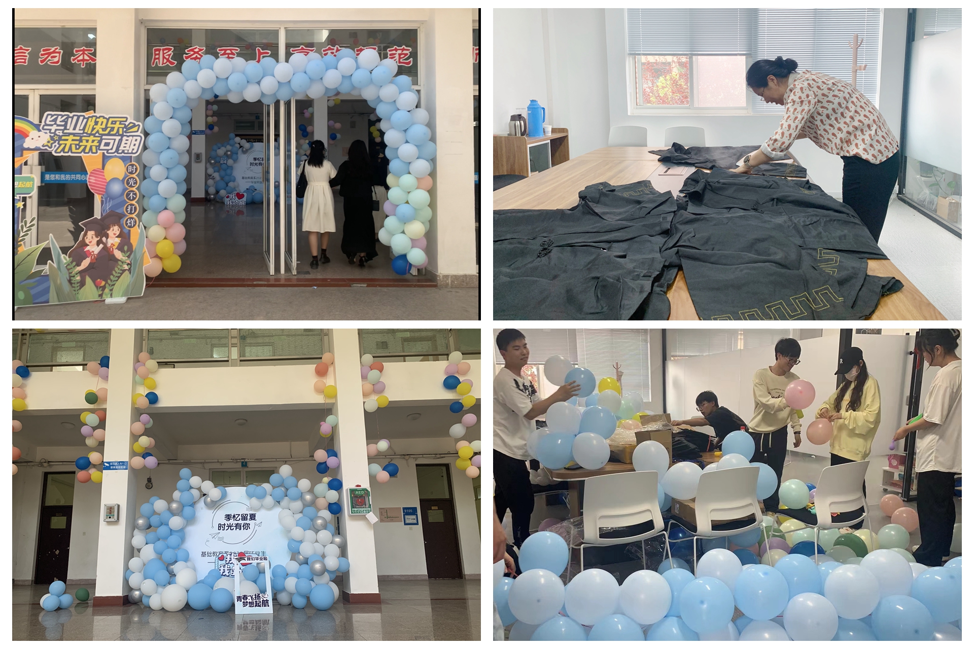 活动的前一天,毕业班的一些班委们提前来到学校和大一大二的学弟学妹们开始做欢送会的准备工作,他们把9号楼的大厅进行了精心的布置,辅导员沈言静老师还从家带来熨斗亲自为学生熨烫学士服。
