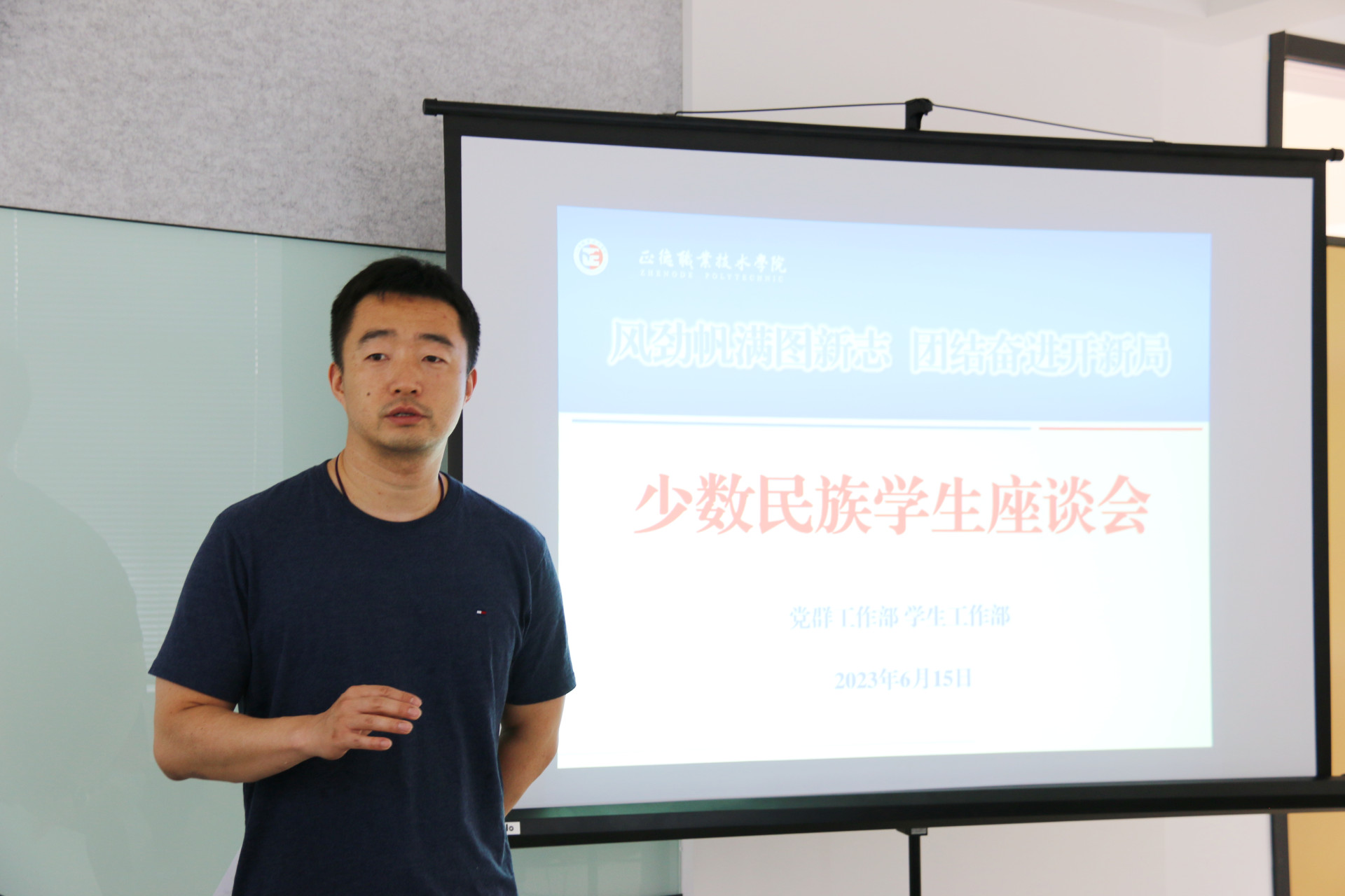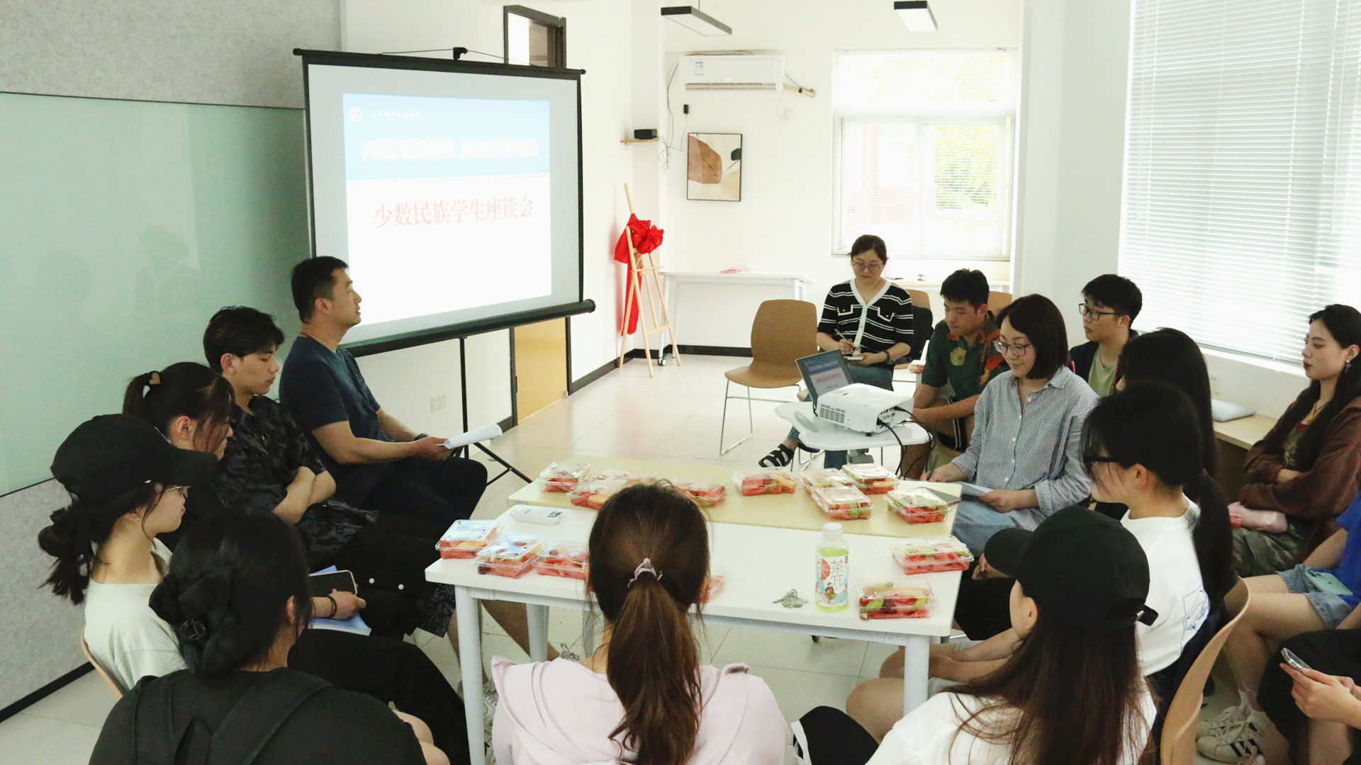 为深入学习贯彻习近平总书记关于民族团结进步工作的重要精神指示,进一步提升少数民族学生教育、管理和服务工作,铸牢中华民族共同体意识,促进各民族学生交往交流交融,6月15日下午,探花porn 在“一站式”学生社区召开了少数民族学生座谈会,党群工作部副部长周慧、相关老师以及来自7个民族的16名少数民族学生代表参加了本次座谈会,座谈会由学生处副处长毛茂主持。