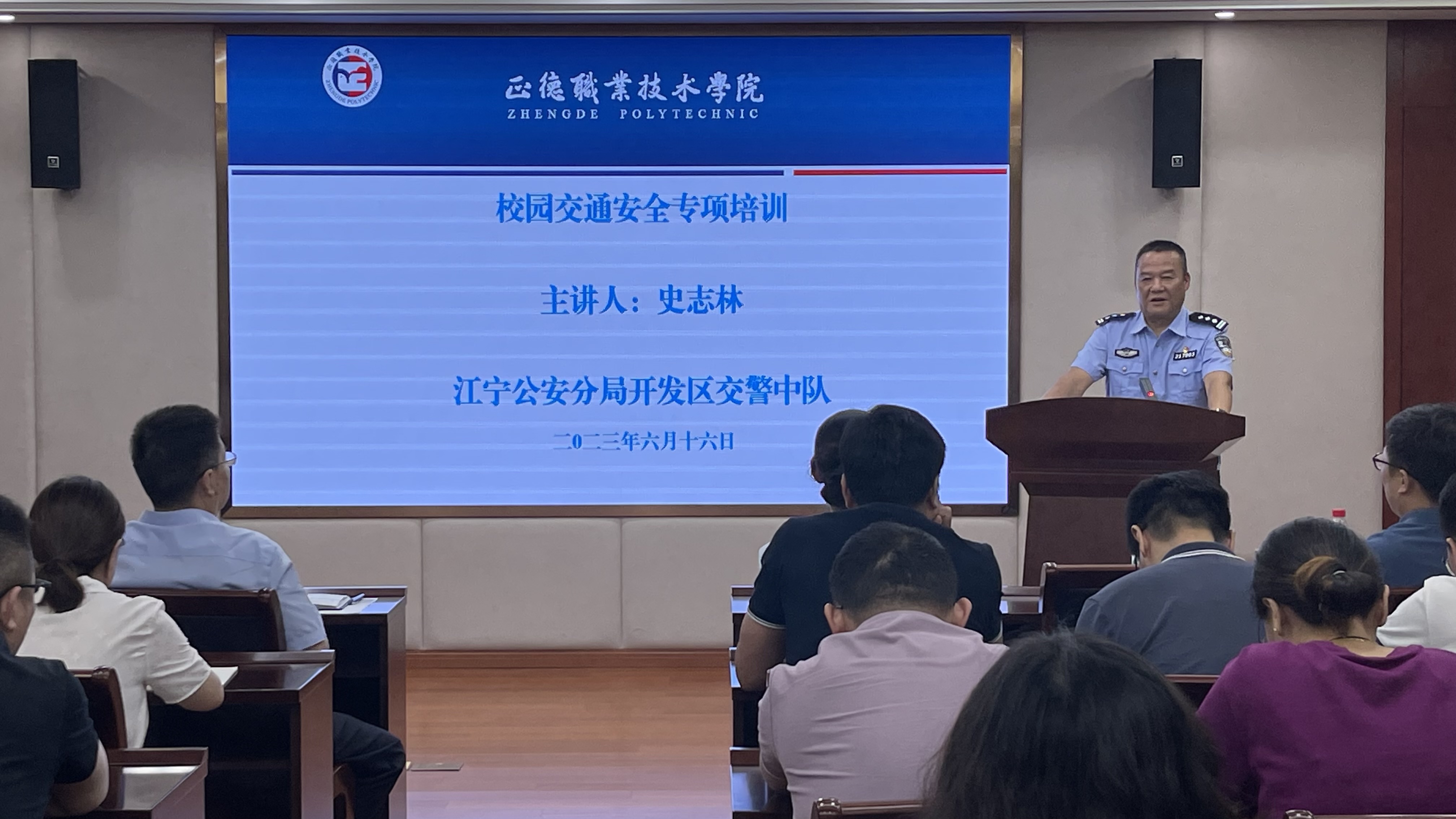 为加强校园交通安全管理,提升师生的交通安全意识,保障师生的人身安全,共创安全有序的校园环境,2023年6月15日,江宁区公安分局开发区交警中队史志林警官到校为探花porn 师生开展校园交通安全专题培训。院领导高斌、梁薇,保卫处、学生处及全体学工干部参加培训。