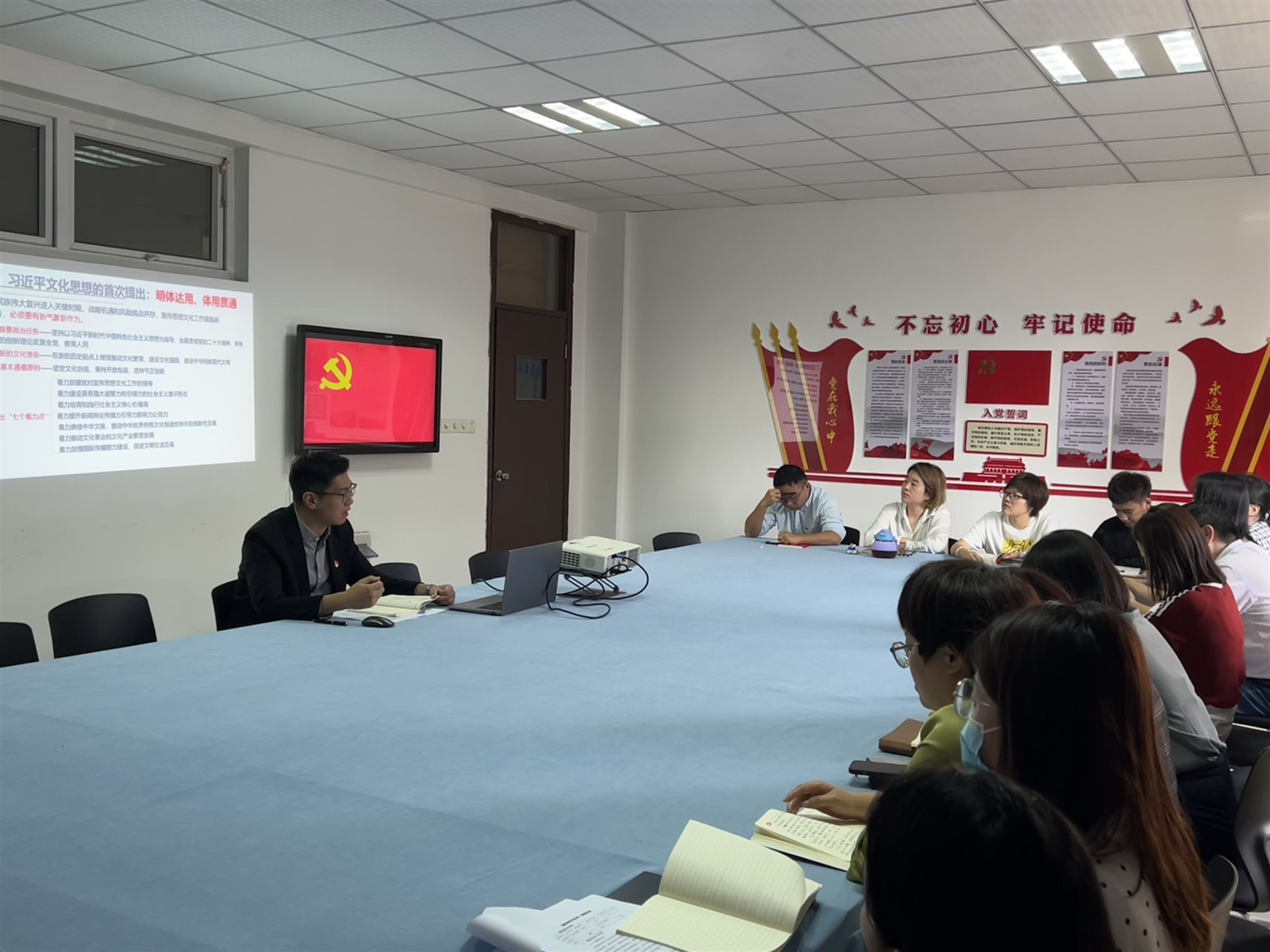 思想之光照亮前行之路。习近平文化思想,是新时代党领导文化建设实践经验的理论总结,是对马克思主义文化理论的丰富和发展,是习近平新时代中国特色社会主义思想的文化篇。与会党员集中学习了习近平总书记对宣传思想文化工作的重要指示精神,支部书记赵欣从习近平文化思想的首次提出、四大特征、科学内涵等方面给支部全体党员带来一堂《深入学习领会习近平文化思想》的专题党课。赵欣强调,要以习近平文化思想为指引,坚定文化自信,用好身边的丰富红色资源,在实践中讲好红色故事,扩大红色文化的影响力。