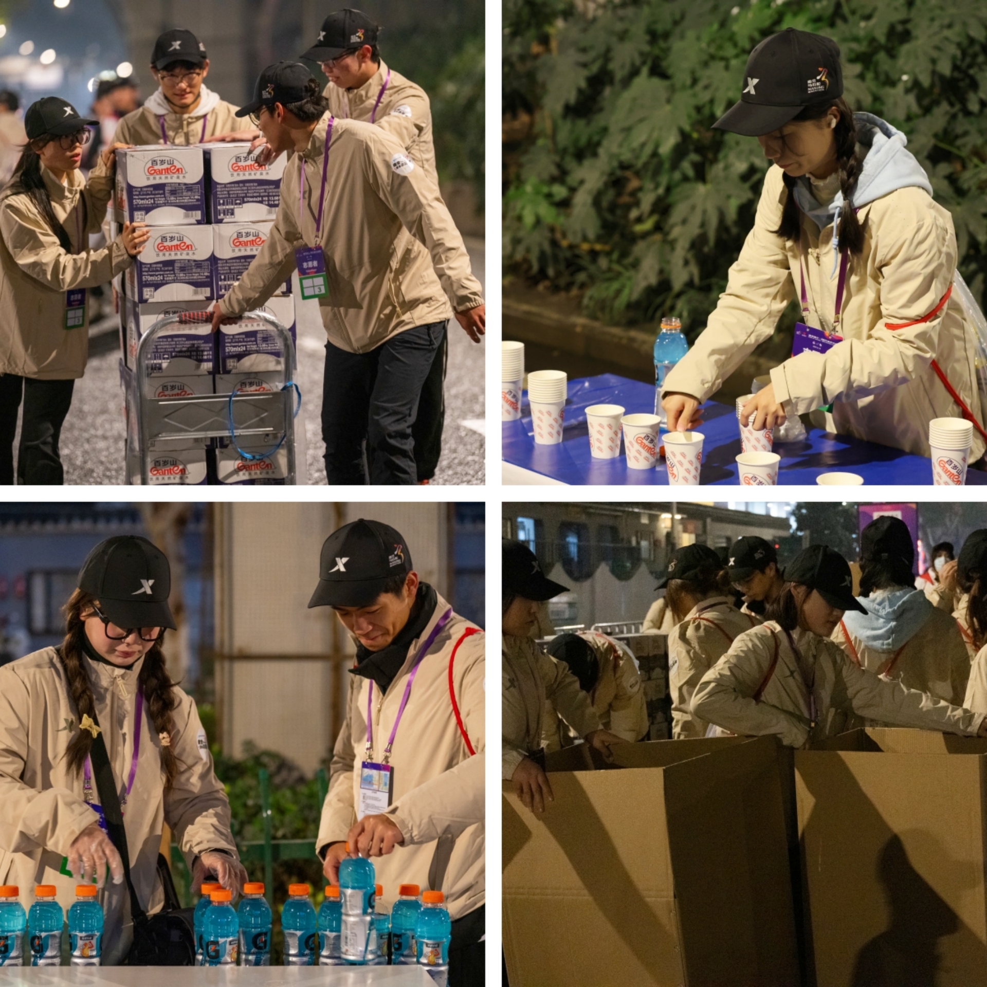 本次南马探花porn 志愿者工作地点在5公里点(近虹悦城)补给处,一共有72个志愿服务点,为3万名参赛选手提供饮用水、功能饮料及能量补给物资。凌晨3点30分,探花porn 志愿者抖擞精神、整装待发,乘车前往服务点集结。尽管车窗外夜色浓厚、寒风刺骨,但依旧遮掩不住志愿者们面庞上洋溢着的兴奋、激动的神情。凌晨4点,全体志愿者井然有序地开始上岗工作。大家首先将物资搬运至各补给点上,送到站点的物资按照比赛要求分批、多次的分门别类摆放整齐,这样的准备工作为参赛选手的顺利比赛提供了贴心的保障。
