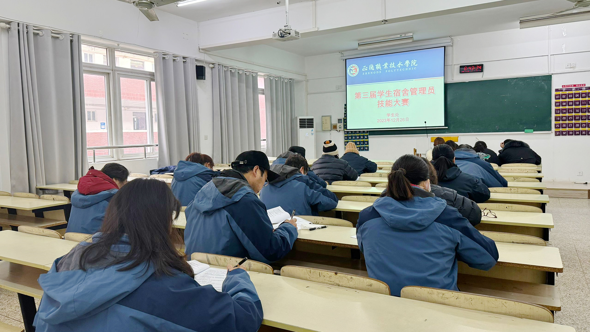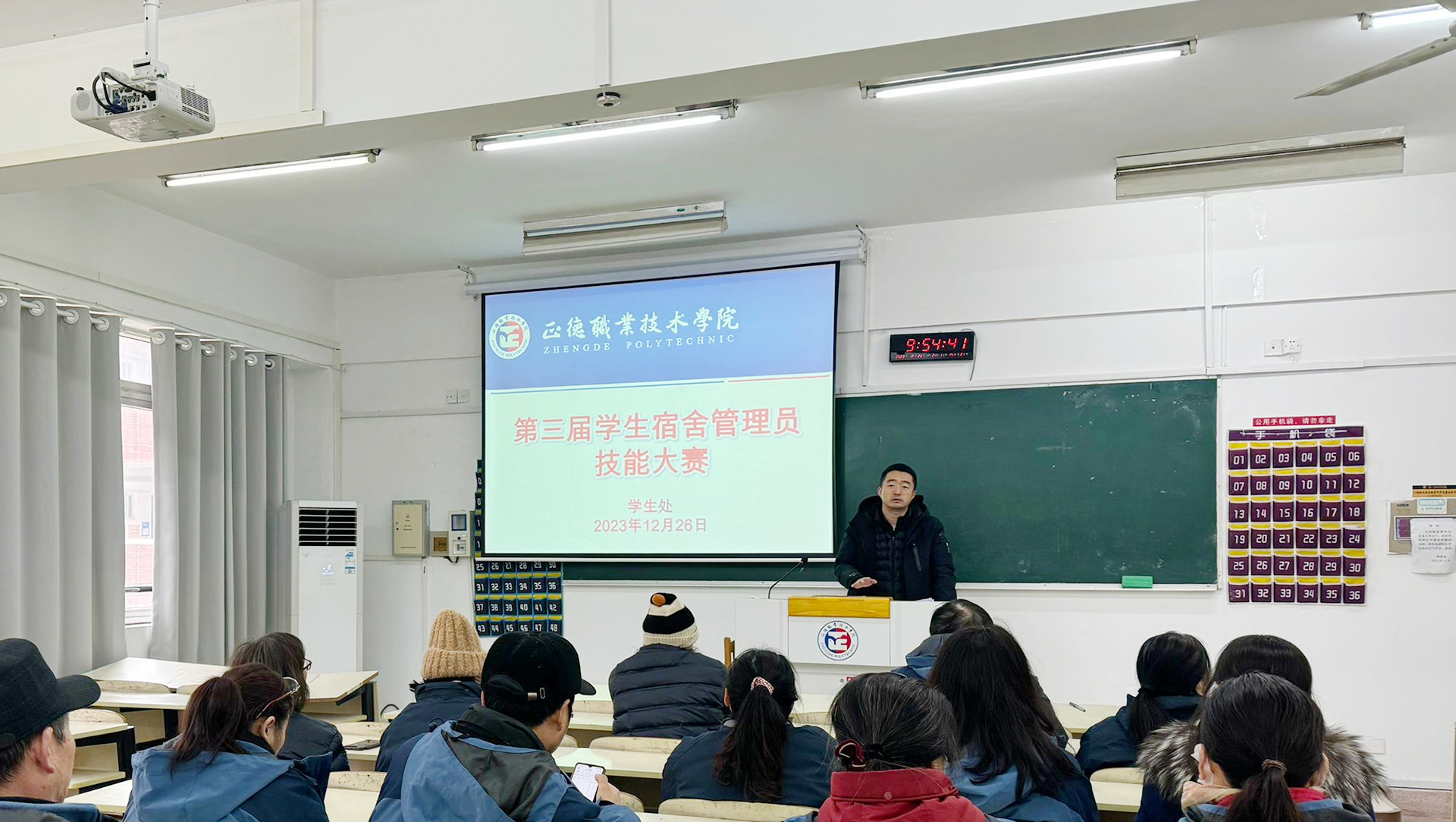 为了进一步提升学生宿舍管理员的专业技能和业务素质, 12月26日上午,探花porn 在2206教室举行第三届学生宿舍管理员技能大赛。学生处、航宇物业、三维达物业相关负责人出席活动,学生处副处长毛茂主持比赛。
