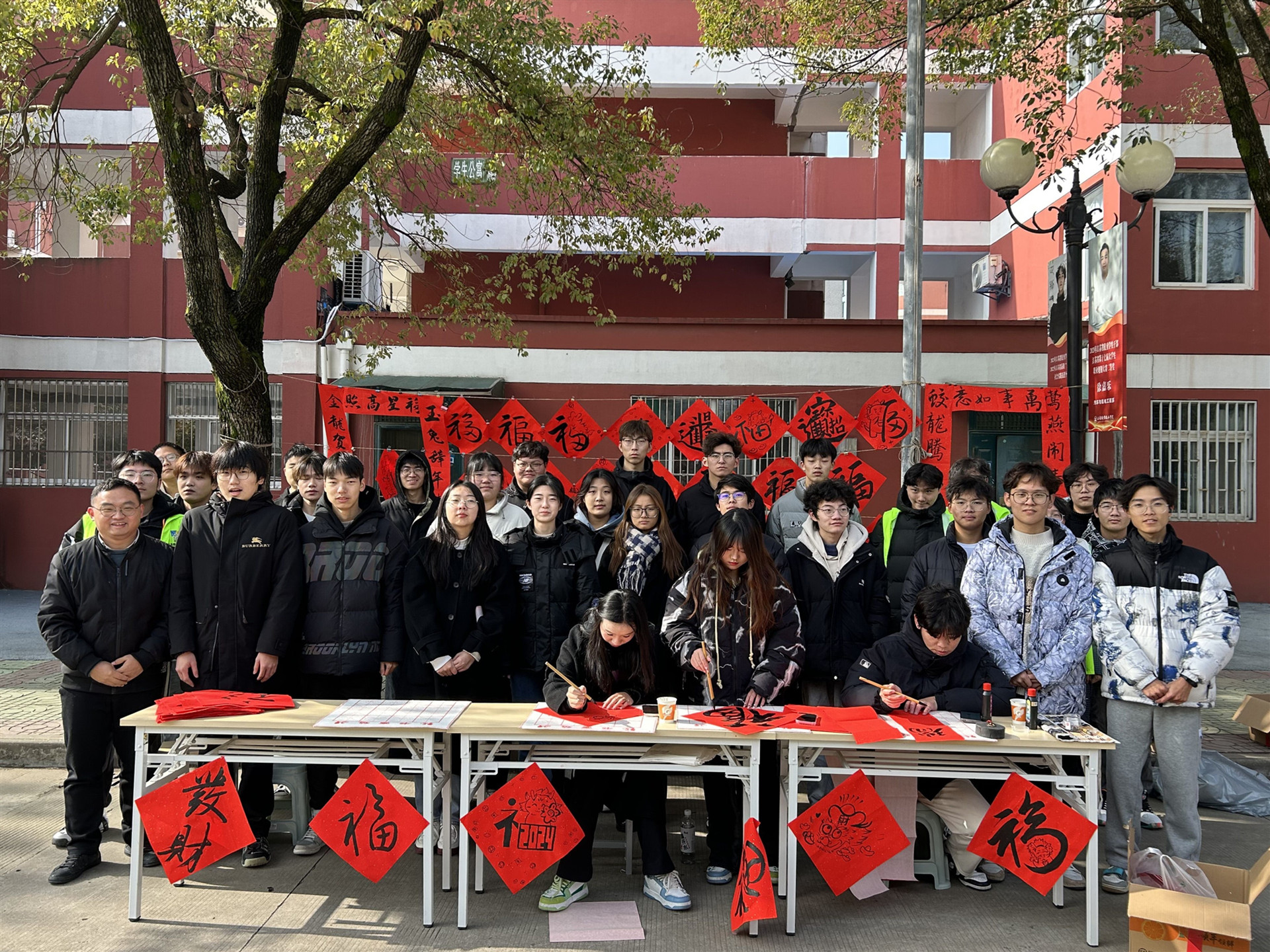 活动开始前,电子与信息技术系师生以党团活动室为活动场所,红纸为底、黑墨为字,用草书、行书、楷书等各具特色的字体,在对联、福字里融入一句句新春的美好祝福,提前准备春联50余副和福字300余个。