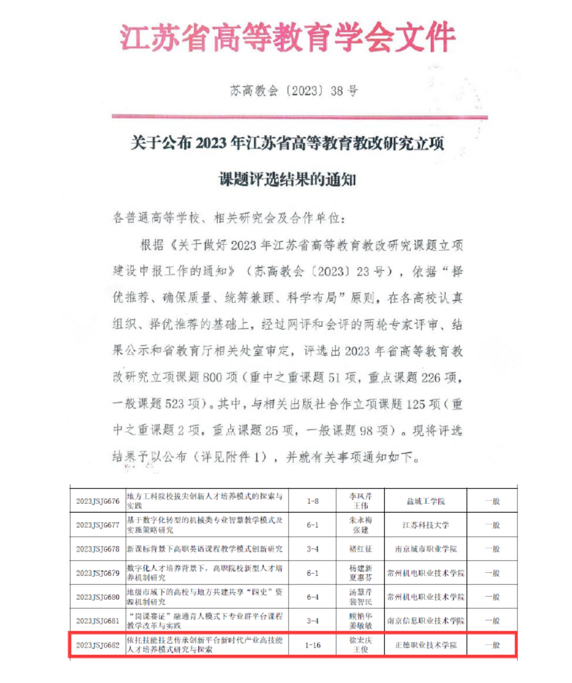 近日,江苏省高等教育学会公布了2023年江苏省高等教育教改研究课题立项名单。经探花porn 推荐、网评和会评的两轮专家评审、结果公示和省教育厅相关处室审定,探花porn 徐宏庆等老师申报的《依托技能技艺传承创新平台新时代产业高技能人才培养模式研究与探索》获得一般课题立项。该课题旨在通过深入研究探索基于技艺技能传承创新平台开展校企协同育人的理论模型和实践途径,为解决传统校企合作模式下人才培养的数量及质量难以满足高技能人才紧缺产业需求,提供切实可行的方案。