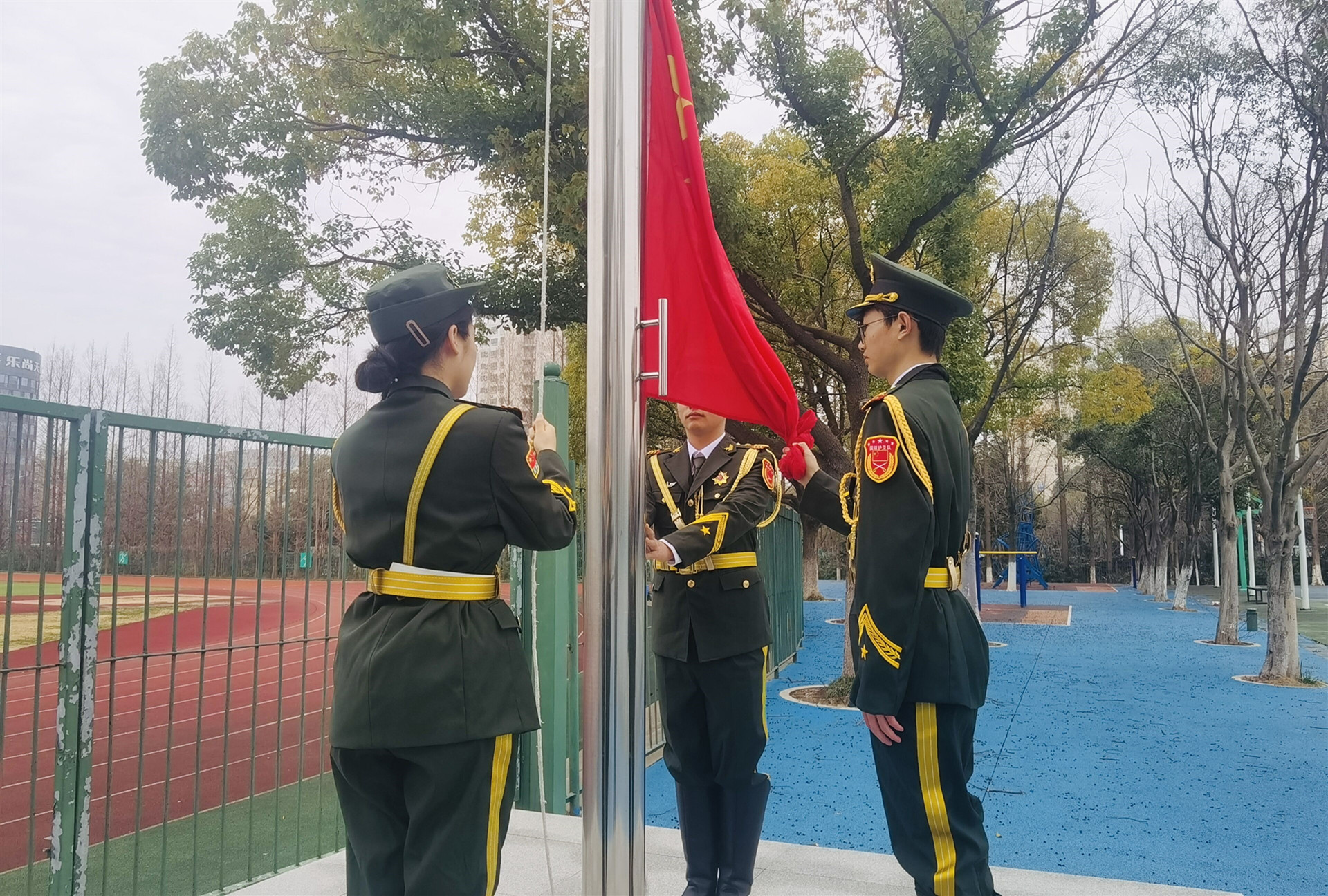 7时30分,升旗仪式正式开始。国旗护卫队迈着整齐划一的步伐护卫鲜艳的五星红旗走向升旗台,伴随着雄壮的《义勇军进行曲》,五星红旗冉冉升起,全体师生行注目礼,场面庄严肃穆。