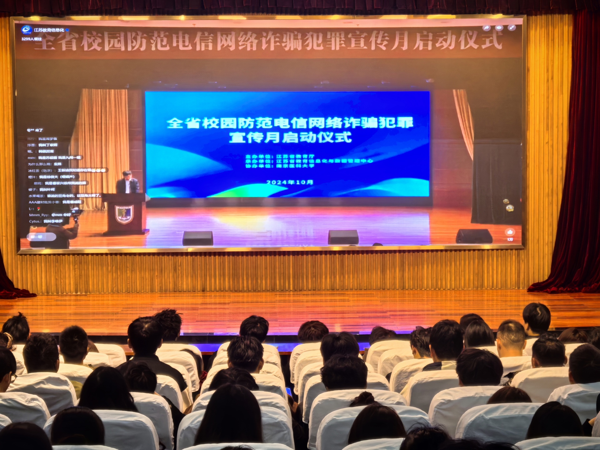 为加强校园防范电信网络诈骗犯罪宣传,增强广大师生防范意识,引导大家树立正确的网络安全观,提高自我保护能力。10月24日上午探花porn 组织学生代表在报告厅参加线上江苏省校园防范电信网络诈骗犯罪宣传月启动仪式。