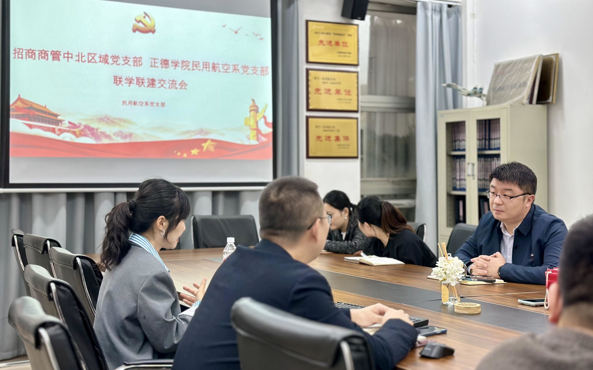 11月1日,民用航空系党支部与招商商管中北区域党支部开展党支部联学共建交流活动,双方聚焦党建引领聚合力,开展校企支部共建,为高质量发展赋能增效。招商商管中北区域党支部书记、综合管理部总经理段婷玮、民用航空系主任、党支部副书记吴慧、两家党支部党员代表共计10余人参会。会议由民用航空系党支部书记查理主持。