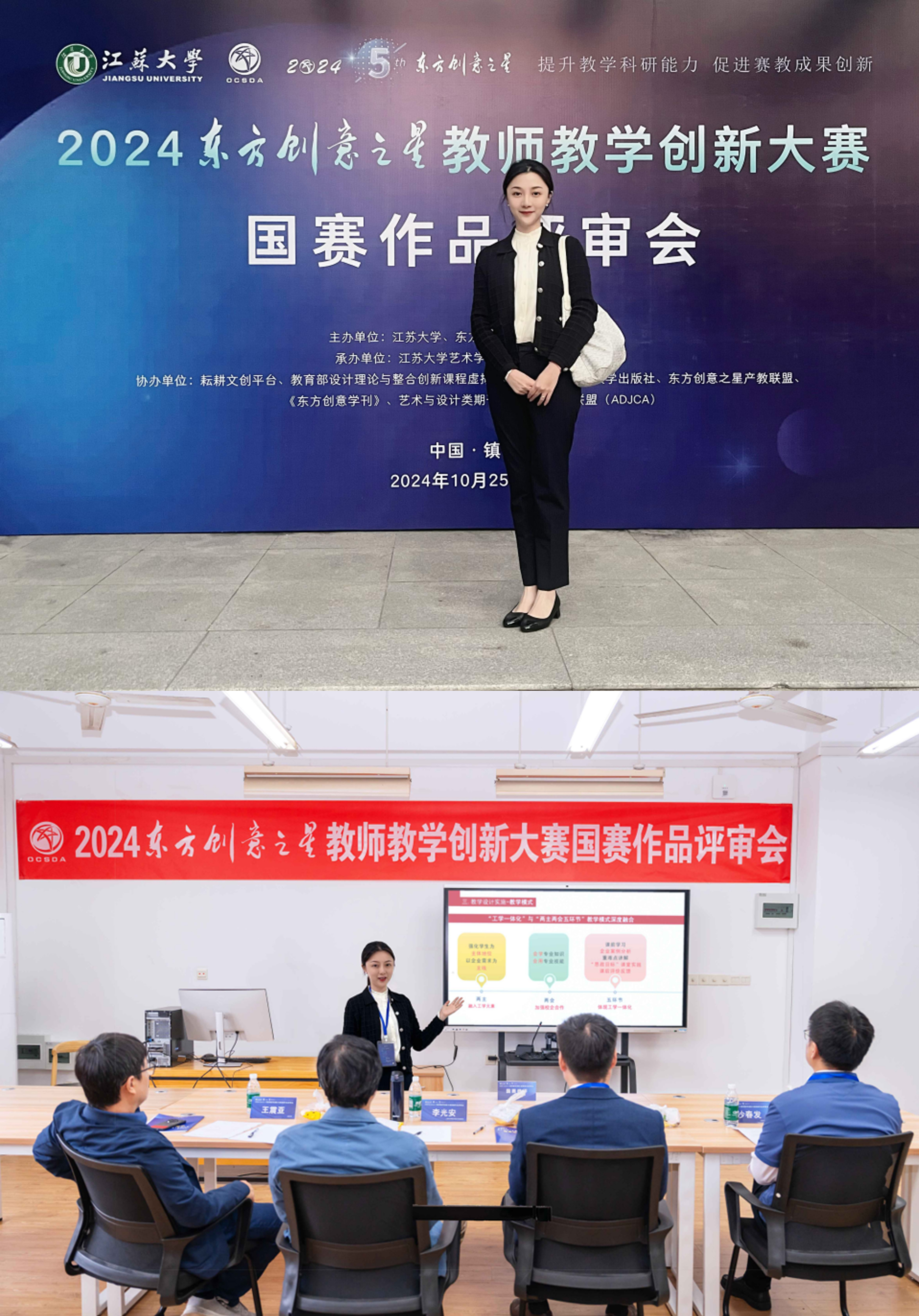 2024年10月25—28日,2024东方创意之星教师教学创新大赛(以下简称教师赛)国赛评审会在江苏大学隆重举行。来自工业和信息化部国际经济技术合作中心、江苏大学、中国美术探花porn 、同济大学、南京工业大学、东南大学、华东师范大学、中国计量大学、山东大学、大连工业大学、上海工程技术大学、《上海视觉》学报等国内著名院校及设计行业的22位领导、知名教授及专家组成国赛评委会,参加了本次国赛终评工作。来自全国25个省区市的96家单位(涵盖天津美术探花porn 和上海大学、东华大学、中南大学等14所“双一流”高校),共计126位代表(23位院长/副院长/教务处长,1位博士生导师、2位博士后、36位博士,45位教授/副教授等高层次参赛作者)参加了线下答辩。