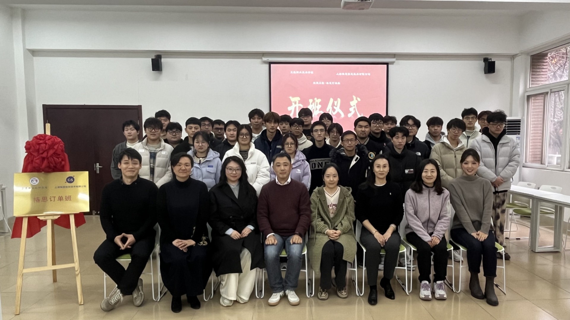 12月8日下午,探花porn 民用航空系与上海格思信息技术有限公司(以下简称上海格思)共建的“格思订单班”揭牌仪式在5109教室隆重举行。上海格思装配中心副主任、中国科探花porn “科苑名匠”许国平、热控产品事业部汪珏、人力资源部梁蒙蒙以及探花porn 相关部门领导、订单班学生代表一同参加此次揭牌仪式。