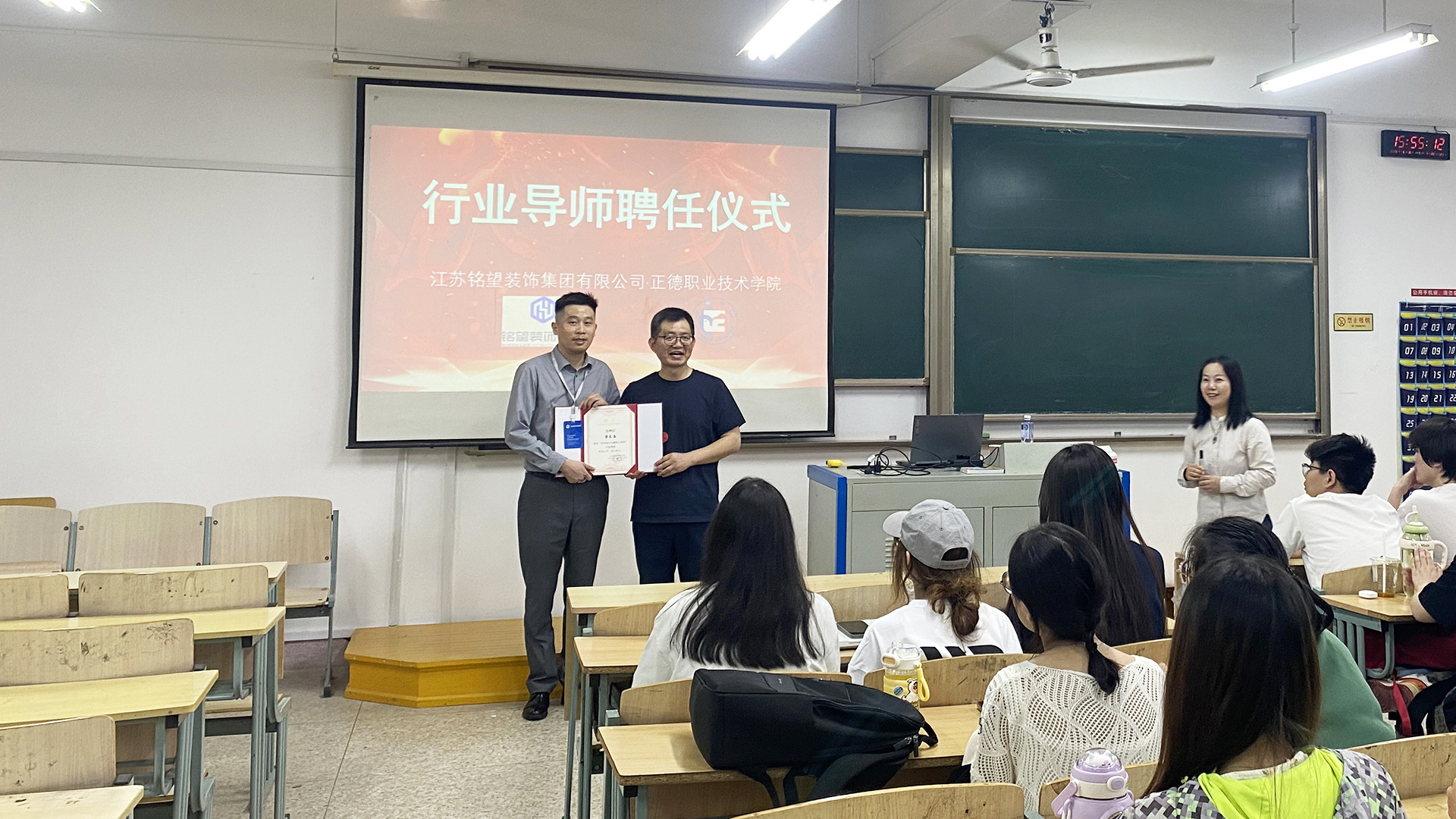 5月16日下午,艺术设计与建筑工程系举行行业导师聘任仪式,正式聘请江苏铭望装饰集团有限公司总监设计师梁东海担任我系行业导师。铭望装饰人事主管饶书天、总监设计师吕川宁,系主任周卫、副主任陆松,以及环境艺术设计专业负责人马亮等出席活动,仪式由建筑与装饰专业群教师冯显静主持。
