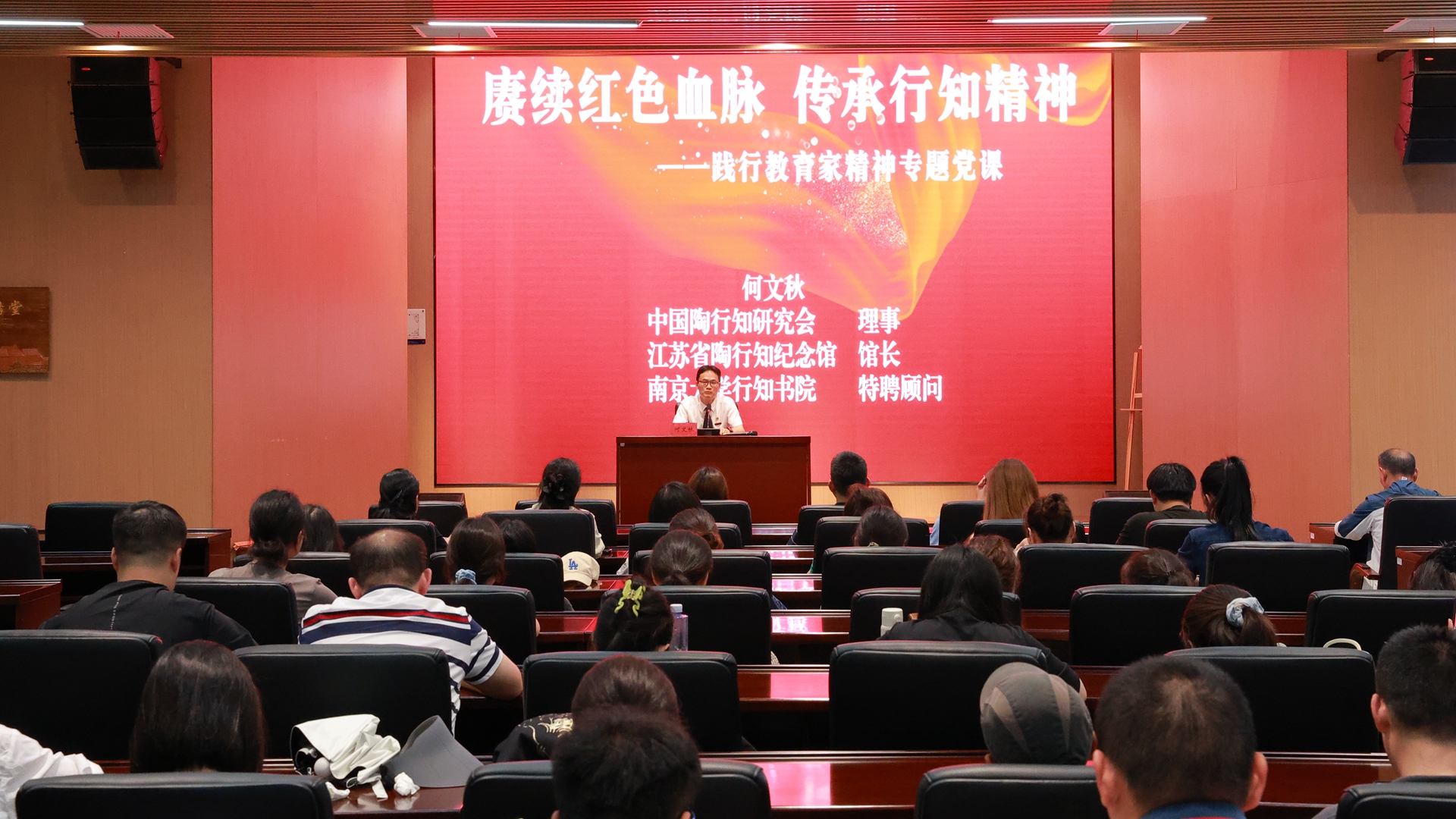 接着,南京晓庄探花porn 陶行知研究院党支部书记、江苏省陶行知纪念馆馆长何文秋,以其深厚的学术功底和丰富的实践经验,为大家带来了一场主题为“赓续红色血脉,传承行知精神”的专题党课。何文秋从陶行知先生“捧着一颗心来,不带半根草去”的教育誓言出发,系统解读了陶行知教育思想的核心要义,深入剖析了“生活即教育”“社会即学校”“教学做合一”三大理念的实践价值。他特别指出,陶行知先生的廉洁奉公、生活简朴精神,与新时代师德师风建设高度契合,是全体党员教师学习的典范。他呼吁全体党员教师以行知精神为镜,严守职业操守,杜绝教育腐败。他引用陶行知名言“千教万教教人求真,千学万学学做真人”,勉励教师们“以真为魂,以廉为基”,做学生成长路上的引路人。何文秋的党课内容丰富、思想深刻,使在场的每一位党员都深受启发。
