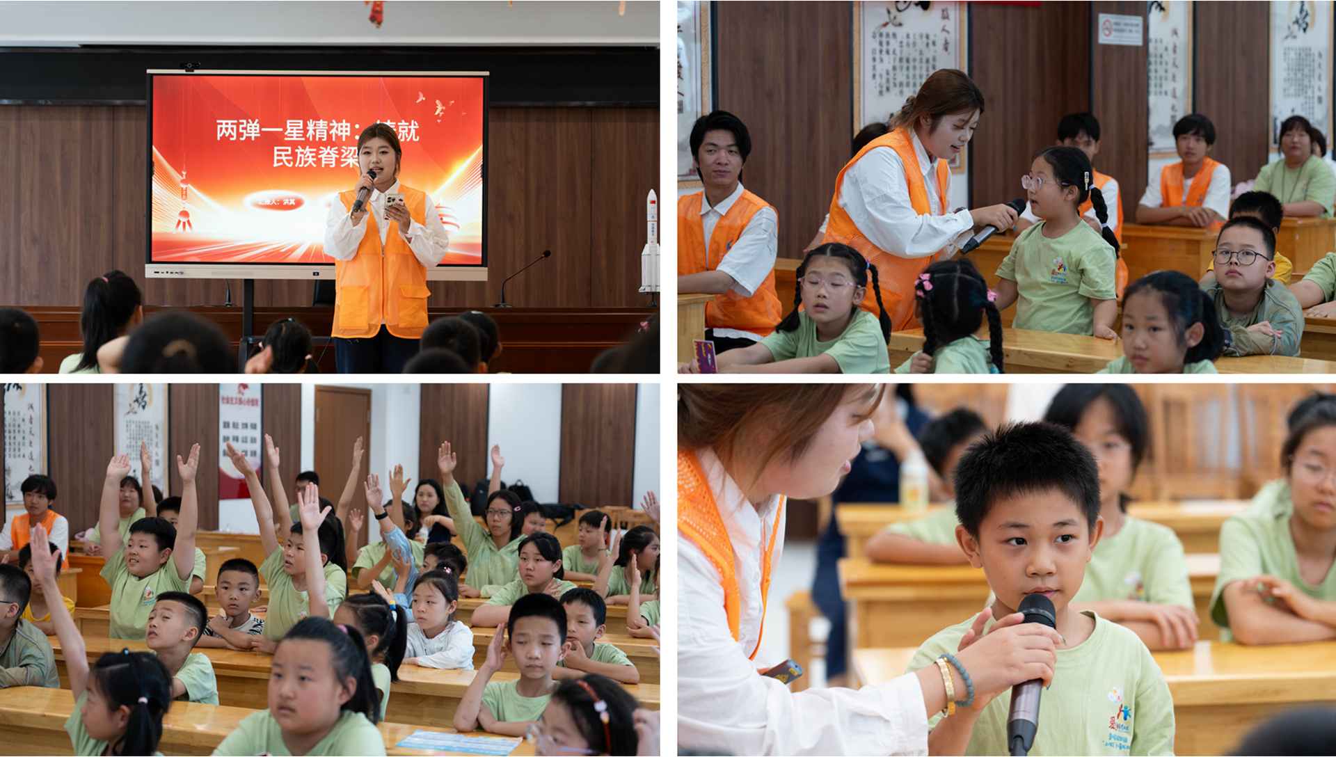 实践团队走进南通市幸福街道社区,开展“传承‘两弹一星’精神”主题活动。成员们通过精心制作的PPT,生动形象地为社区青少年讲述了元勋们的感人事迹与“两弹一星”精神的深刻内涵。孩子们听得津津有味,眼中闪烁着好奇的光芒。互动问答环节中,孩子们积极踊跃回答问题,现场气氛热烈。