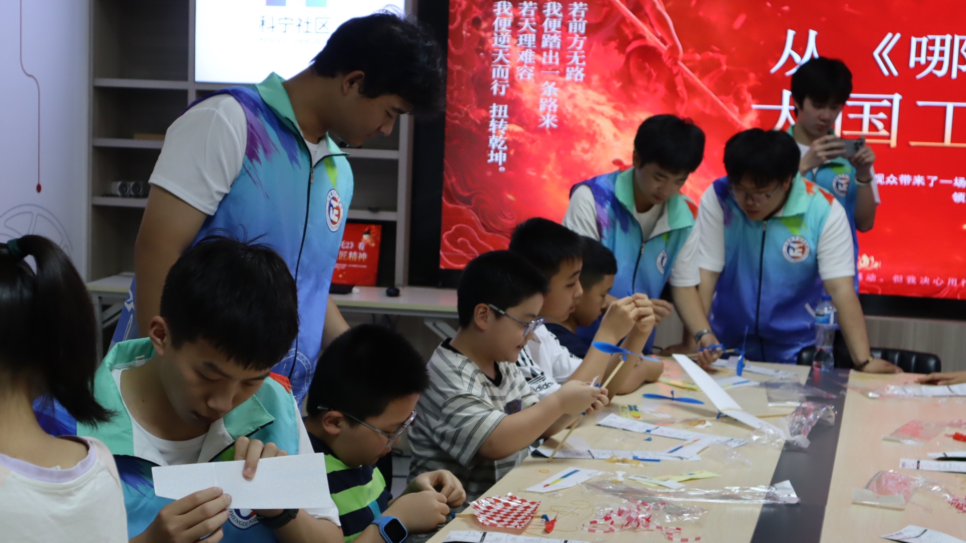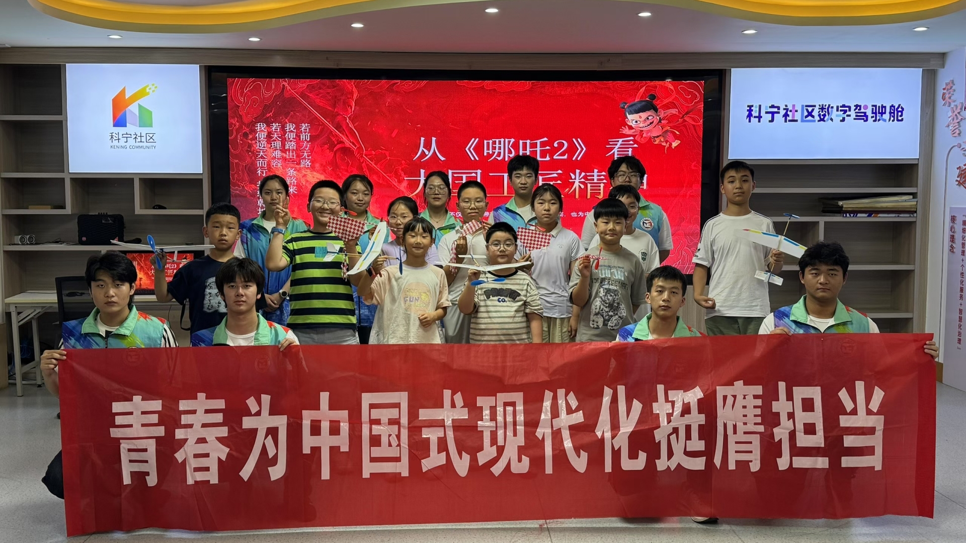 实践团队前往南京科宁社区开展了一场别开生面的工匠精神主题宣讲活动。成员们以电影《哪吒2》为切入点,带领孩子们分组制作手工航模,从机翼打磨到零件组装,成员们耐心讲解每个步骤的工艺要求,让孩子们在动手实践中体会制作的不易,在他们心里种下科技报国的种子,弘扬新时代工匠文化。