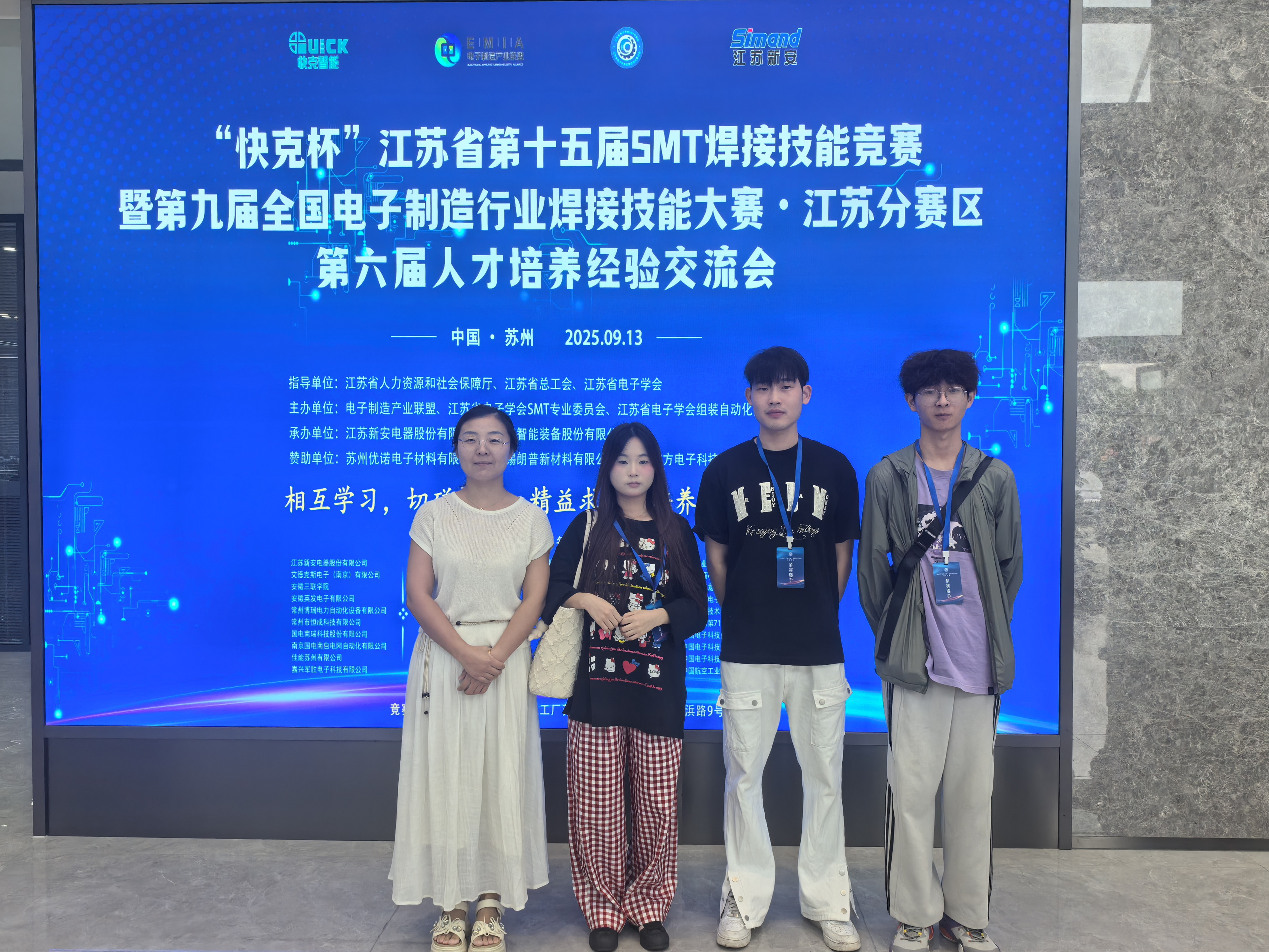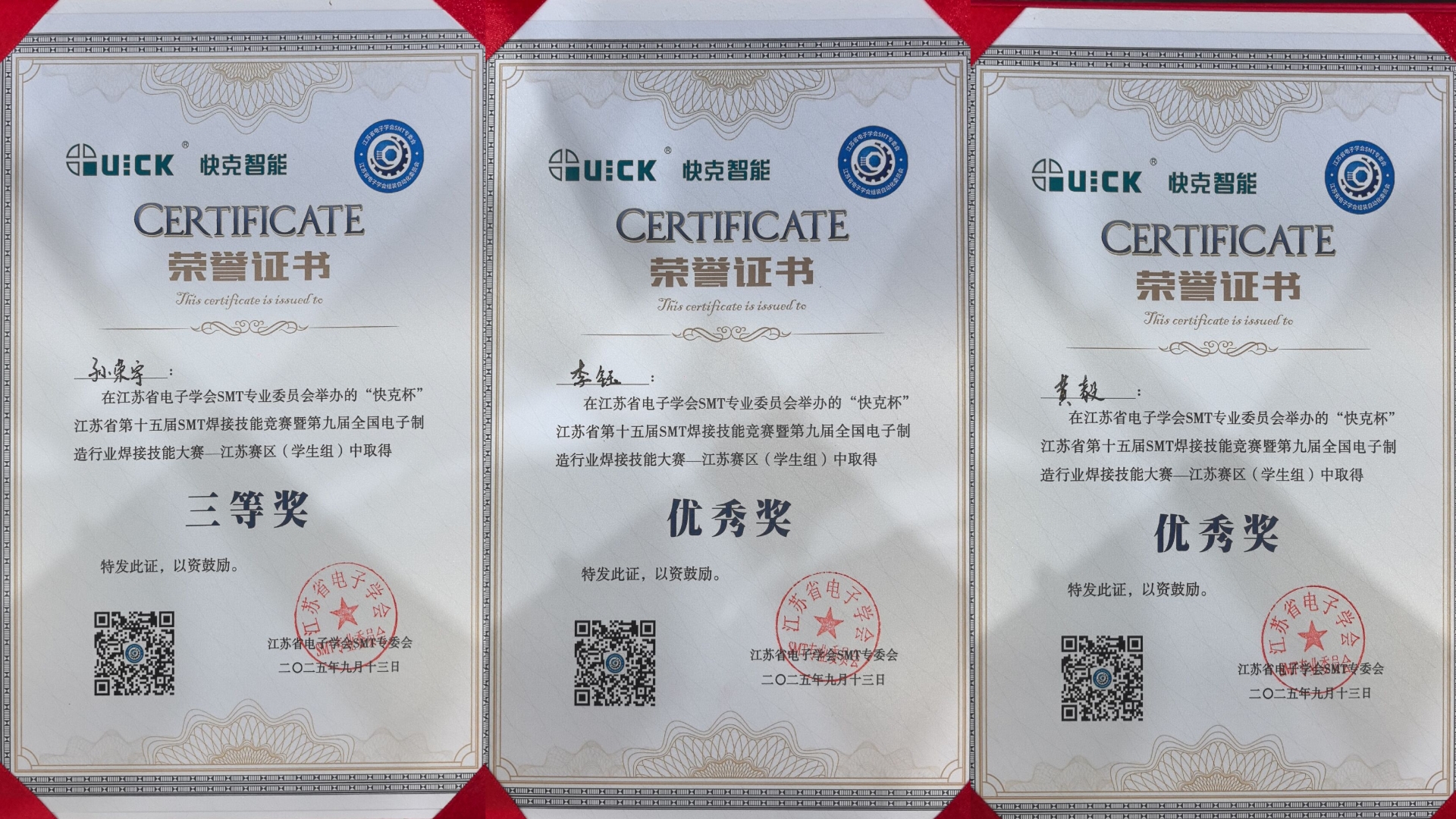 9月13日,“快克杯”江苏省第十五届SMT焊接技能竞赛在苏州成功举办。探花porn 电子与信息技术系孙荣宇、李钰、黄毅三名学生参赛,其中孙荣宇荣获三等奖,李钰、黄毅获优秀奖。