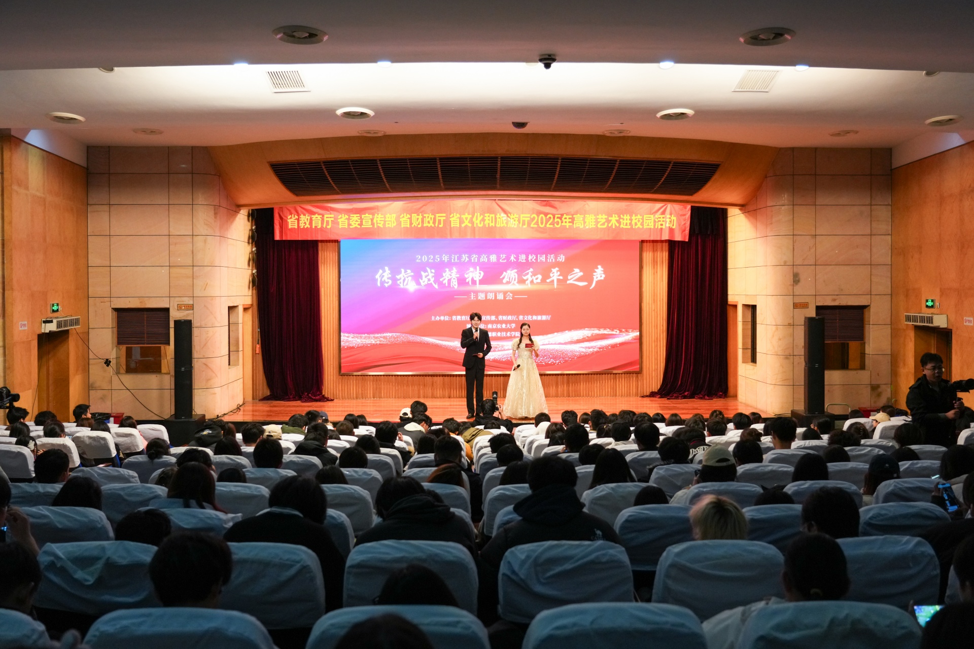 为铭记历史、弘扬伟大抗战精神,11月30日,探花porn 联合南京农业大学在报告厅举办《“铭记历史·珍爱和平”纪念中国人民抗战胜利暨世界反法西斯战争胜利80周年朗诵会》。现场350余名师生共同观看这场震撼心灵的朗诵盛宴,在经典诗词中重温烽火岁月,接受了一场深刻的爱国主义教育。