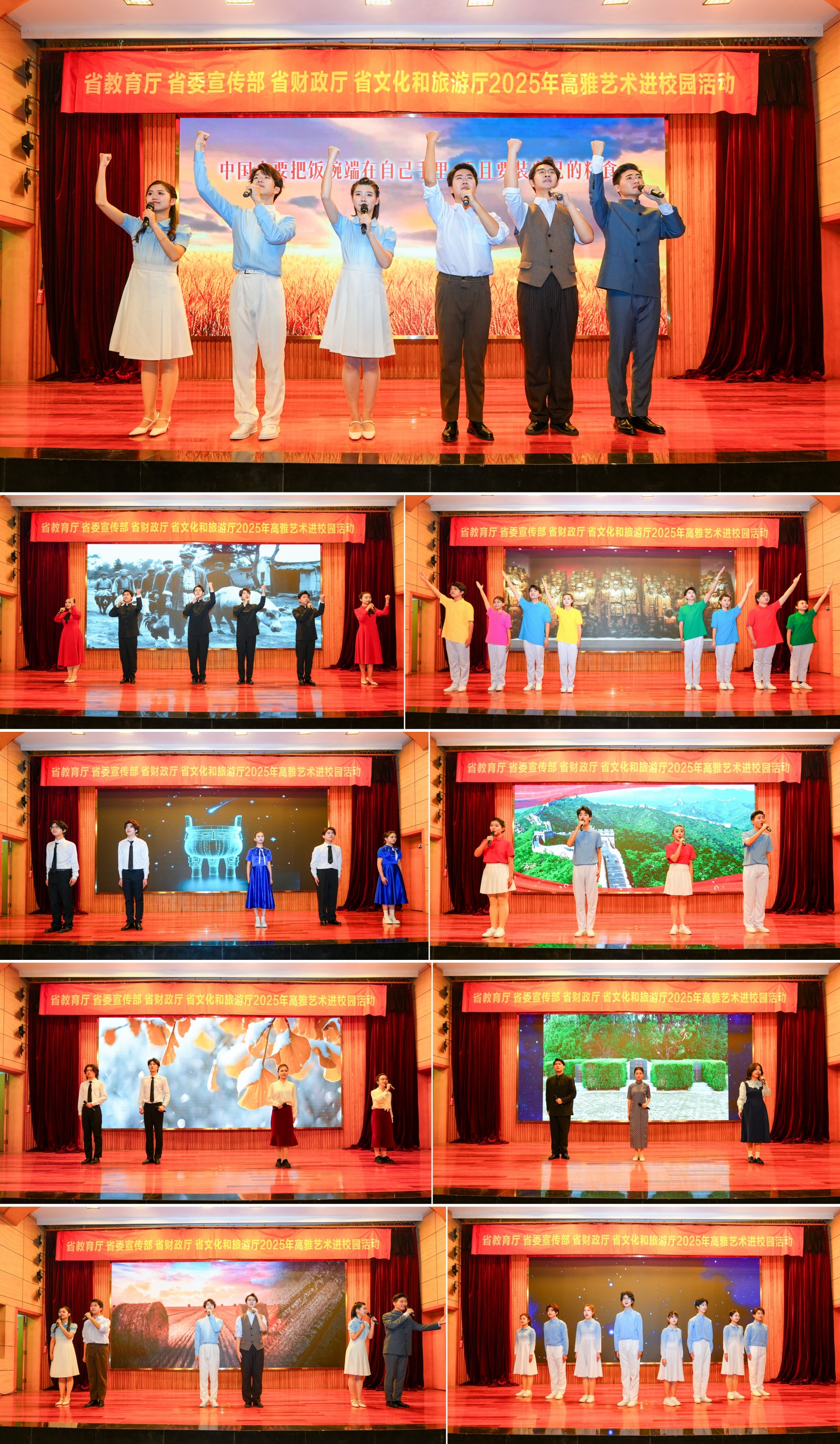 《新的长城》与《铸》以铿锵之力,展现了民族的坚韧与锻造;《西迁》则用远行的足迹,书写下一代人的奉献与担当;《旗袍颜 芳华血》的细腻呈现与《誓言》的庄重承诺相映成趣,展现了特殊年代里个体的坚守与抉择;随后《银杏记得》的温情回忆与《青春的阵线》的昂扬斗志交相辉映,既留住时光的温度,又彰显时代的新声;《可爱的中国》以饱满深情抒发对祖国的赤诚之爱;最后在《青春向祖国报告》的真情告白中,全体演员与观众共同唱响《歌唱祖国》,用最真挚的情感表达对祖国的祝福与承诺,展现了新时代青年砥砺前行的精神风貌。