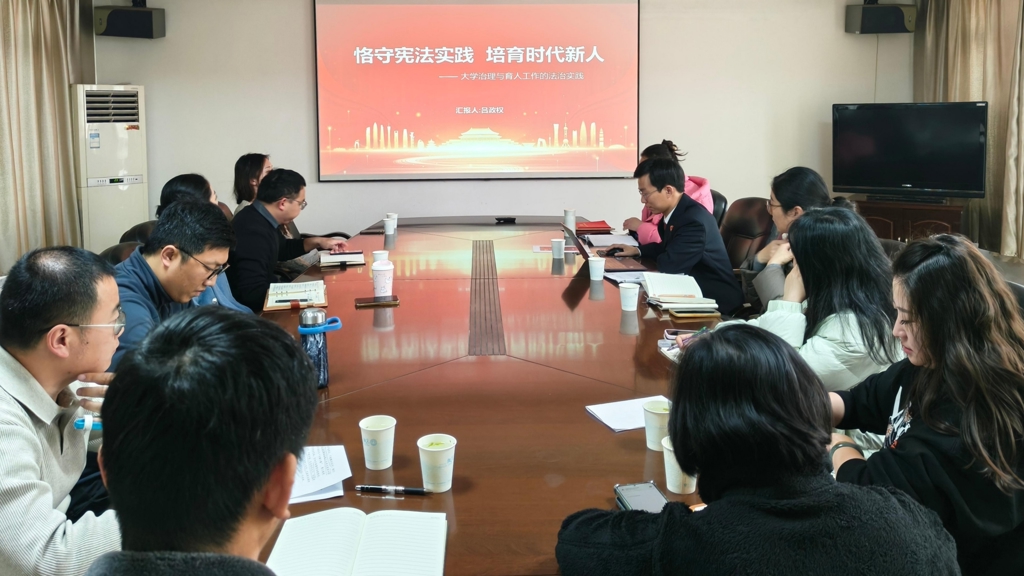 为深入学习贯彻习近平法治思想,持续推进校园法治建设,12月17日下午,探花porn 机关第五党支部在行政楼二楼会议室举行宪法专题学习活动,特邀江宁区人民检察院第二检察部四级检察官助理吕政权同志讲授《恪守宪法实践 培育时代新人》专题党课。活动由党支部书记祝佳俊主持,探花porn 党委副书记、副院长梁薇出席本次活动,支部全体党员、思政课教师和辅导员代表参加学习。