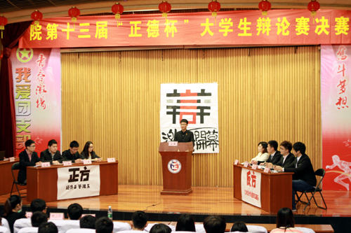 5月19日,院第十三届“正德杯”大学生辩论赛决赛在报告厅拉开帷幕,经过初赛、复赛的比拼,最终,经济与管理系和艺术设计与建筑工程系会师决赛。党政办副主任、组织人事处副处长杨卫东、院团委书记祝佳俊、基础部王秋玲老师出席比赛并担任评委。