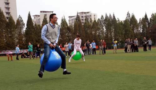 同时进行的还有本届教工趣味运动会,共有四个项目:“瞎子”背“瘸子”、跳跳球接力、篮下投篮、跳长绳。院各工会小组赛前积极训练备战,赛中各小组间相互鼓励、相互竞争,紧张中透着欢笑。经过激烈的角逐,党政办、学生处、团委工会小组以团体总分58分获得第一名;电子与信息技术系工会小组以团体总分48分获得第二名;艺术设计与建筑工程系工会小组以团体总分32分获得第三名。