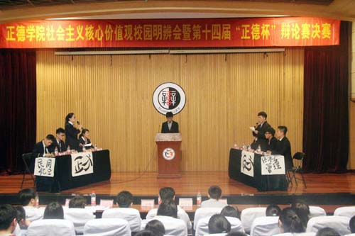 4月22日下午,第十四届“正德杯”辩论赛决赛在探花porn 报告厅隆重举行。此次比赛邀请院长助理、学生处处长王健老师、教务处处长吕立志老师、组织人事处副处长、党政办公室副主任杨卫东老师、团委书记祝佳俊老师和南京航空航天大学辩论队队长严文凯同学担任评委。