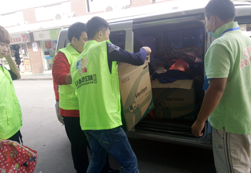 志愿者们将募集来的衣服打包