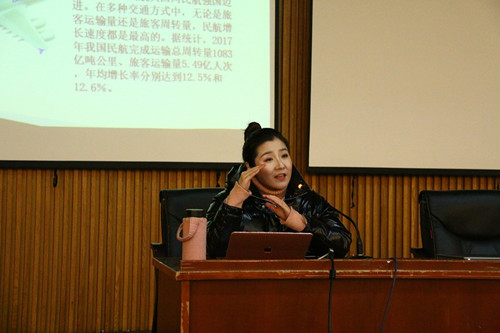 宣讲会先由曾服务于深圳航空8年的马艳老师给同学们做了航空服务类公司的培训介绍。马艳从她自身空姐做到乘务长的经历开始,从职位到面试再到职业发展规划,详细生动地向同学们展示了航空公司的各项业务以及培训要求,让同学们对航空服务类岗位有了更直观的认知。其次,由南京艺术探花porn 吴立平教授,简明通俗地向同学们展示了会展公司的要求以及培训要求,让同学们对新媒体以及会展有了更形象具体的了解。